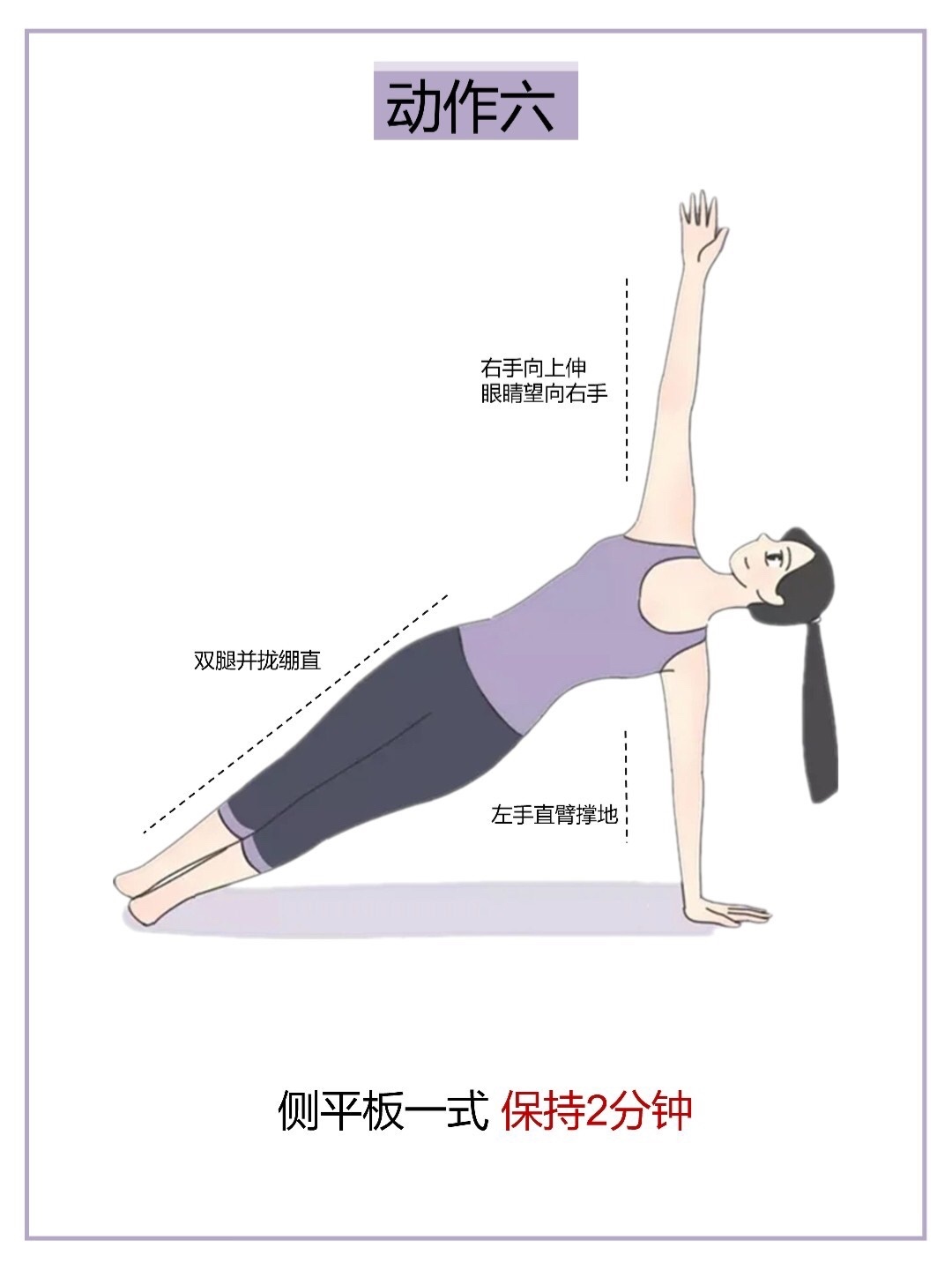 双腿并拢绷直,核心收紧眼睛看向右手保持2分钟