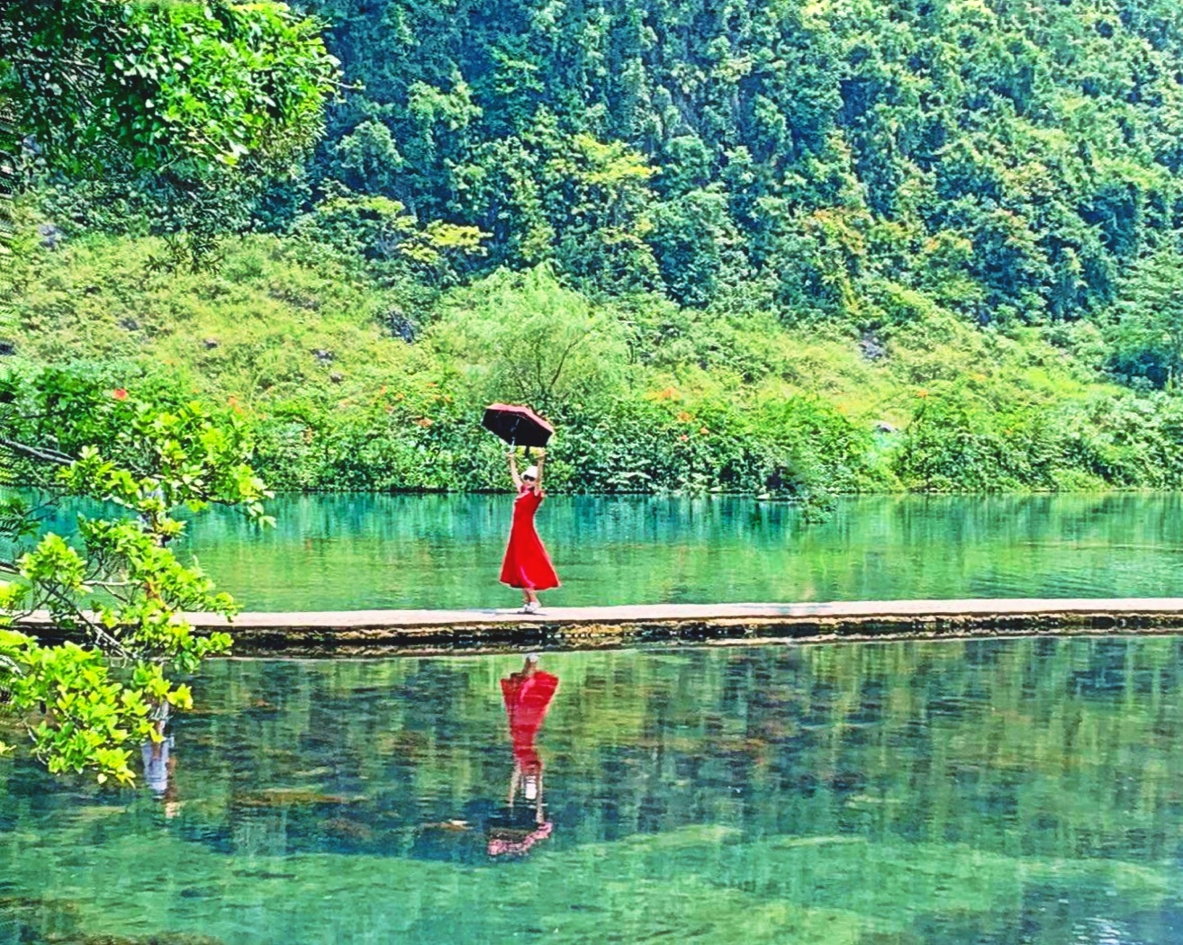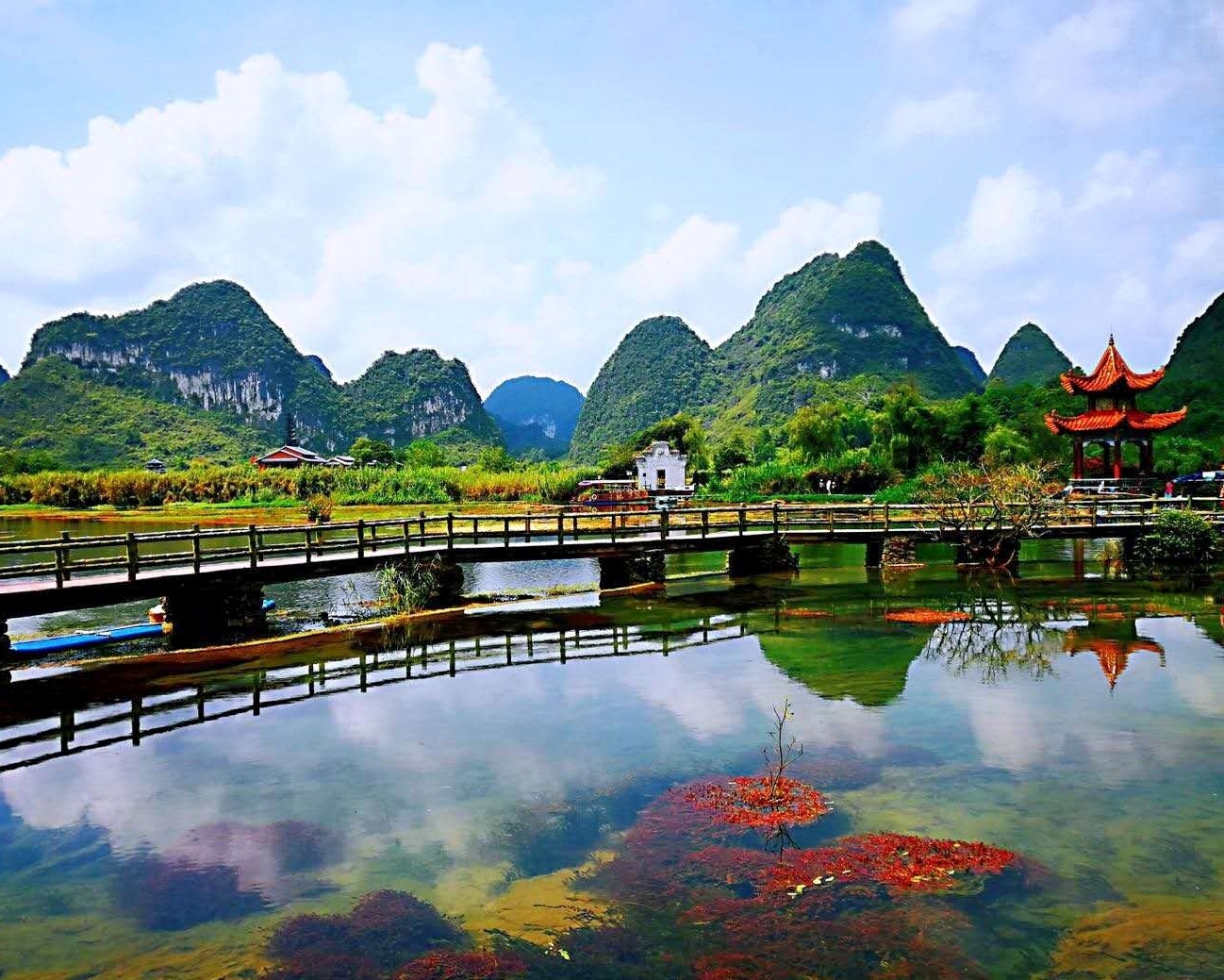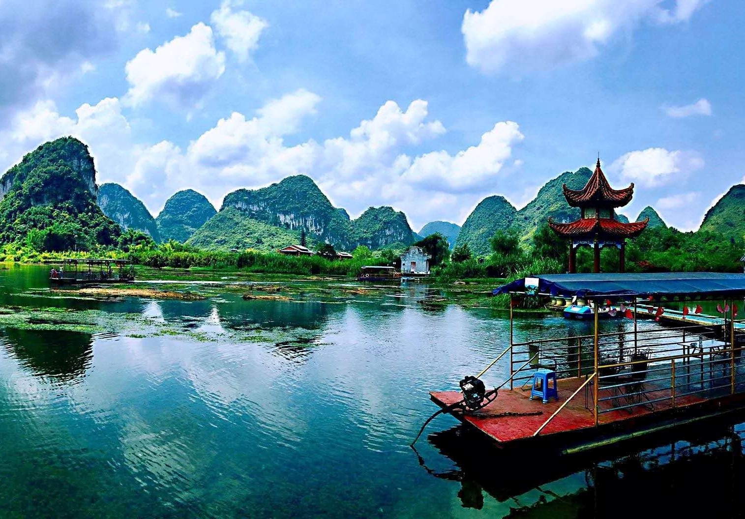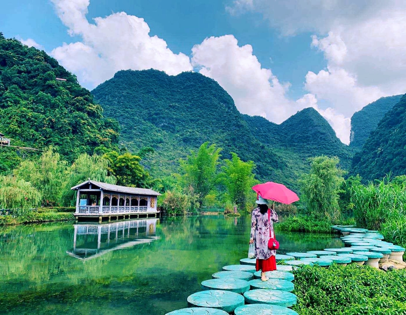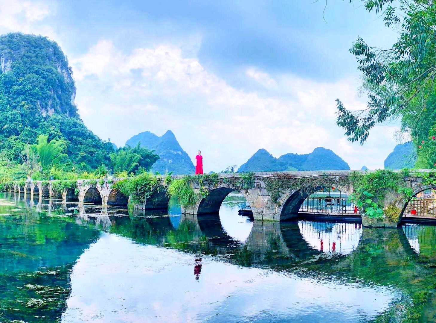 广西靖西鹅泉风景区,德天大瀑布的源头。青山环绕下的鹅泉、水清如镜、鱼虾如梭,一幅壮乡田园美景。靖西的鹅泉、大理的蝴蝶泉、桂平西山的乳泉是我国西南地区的三大泉。