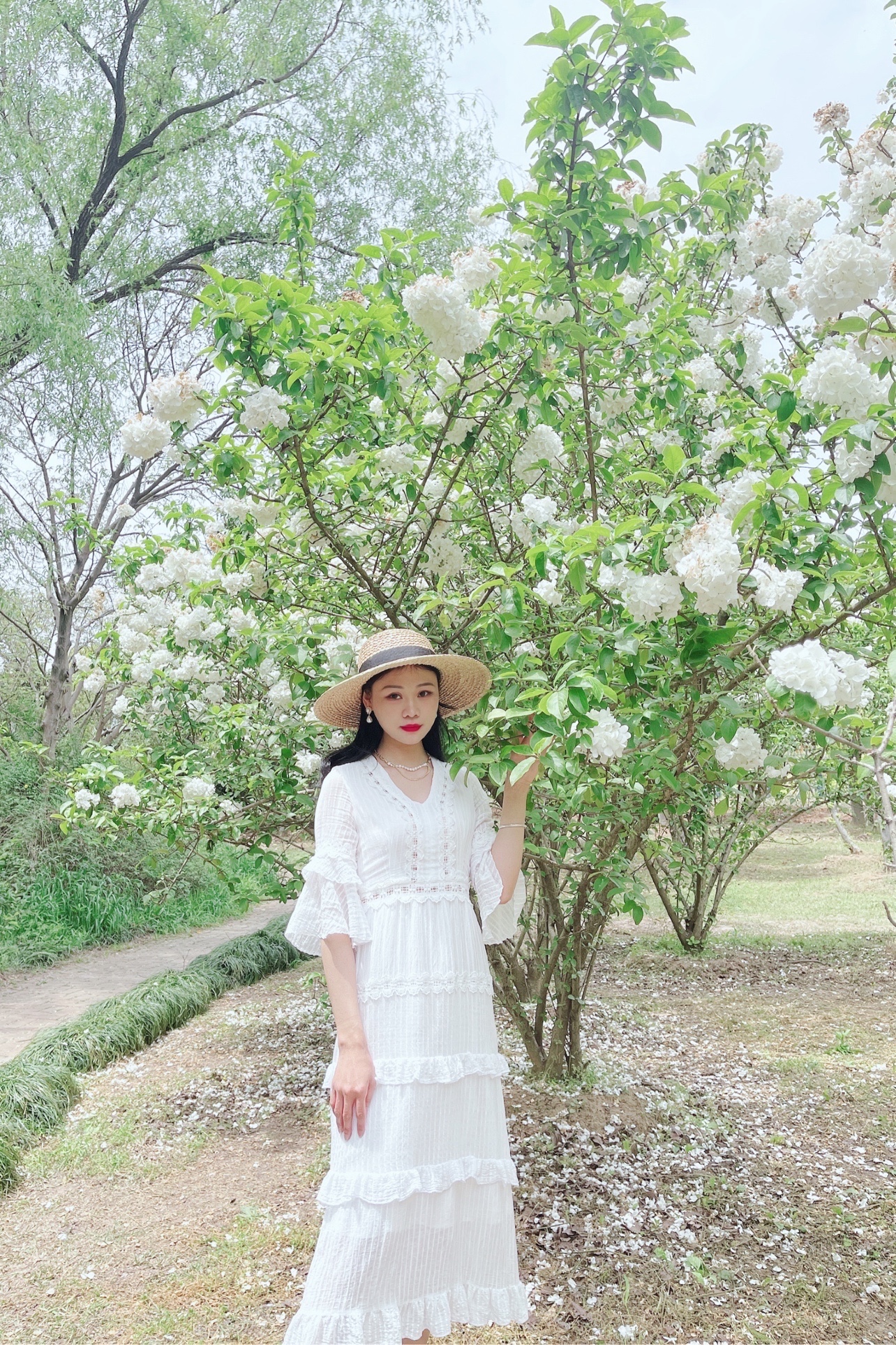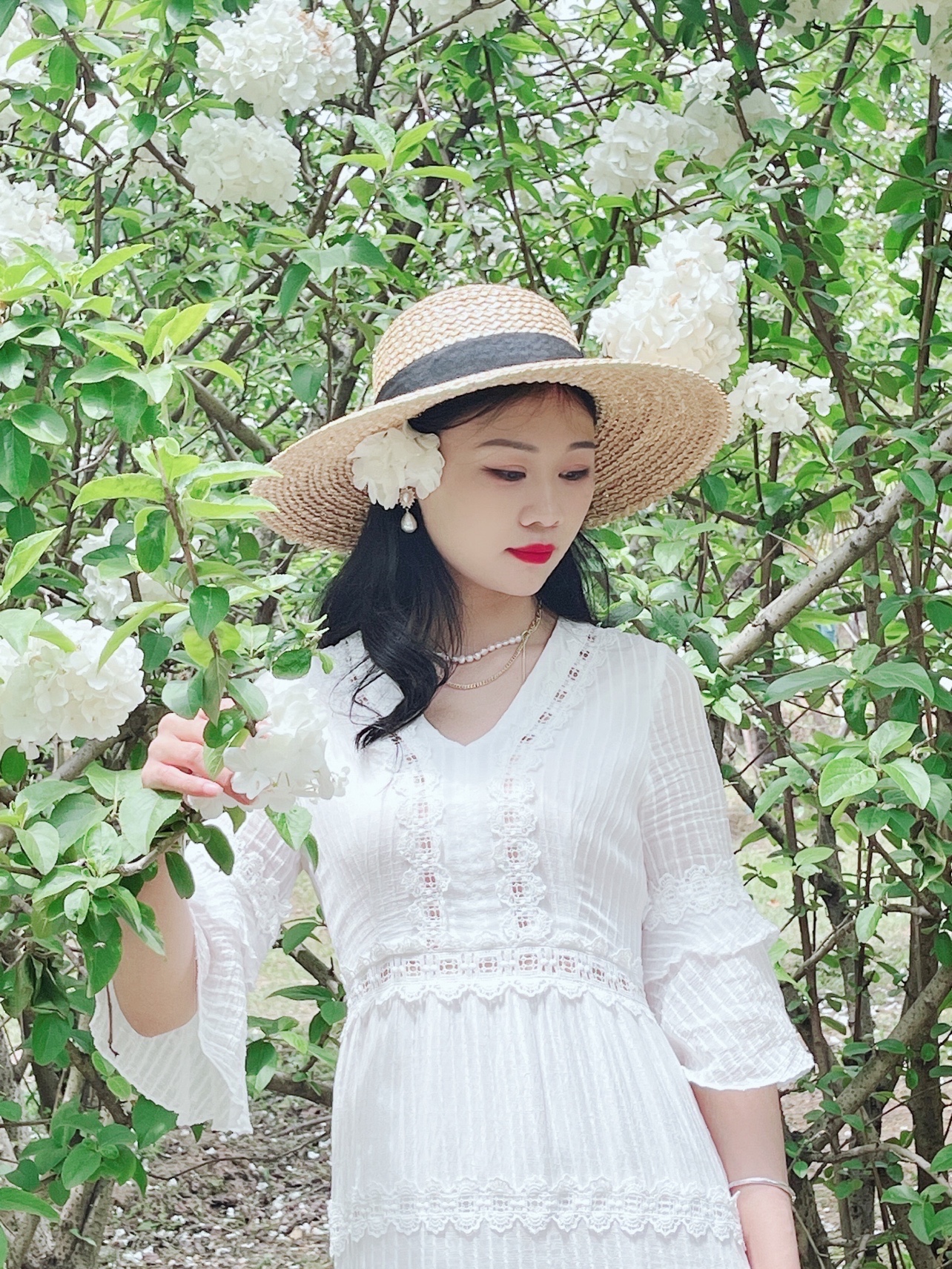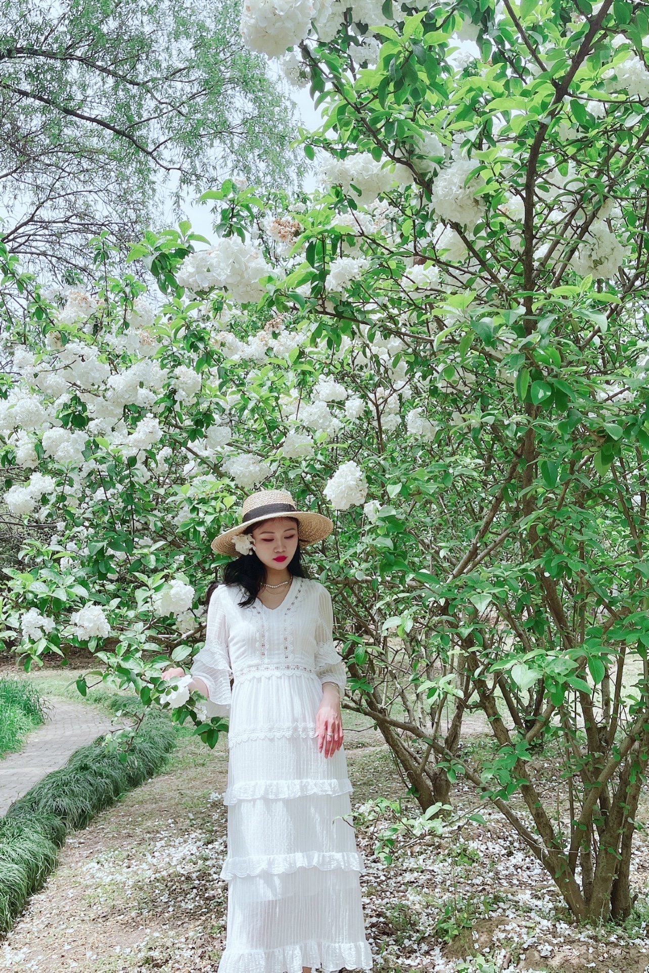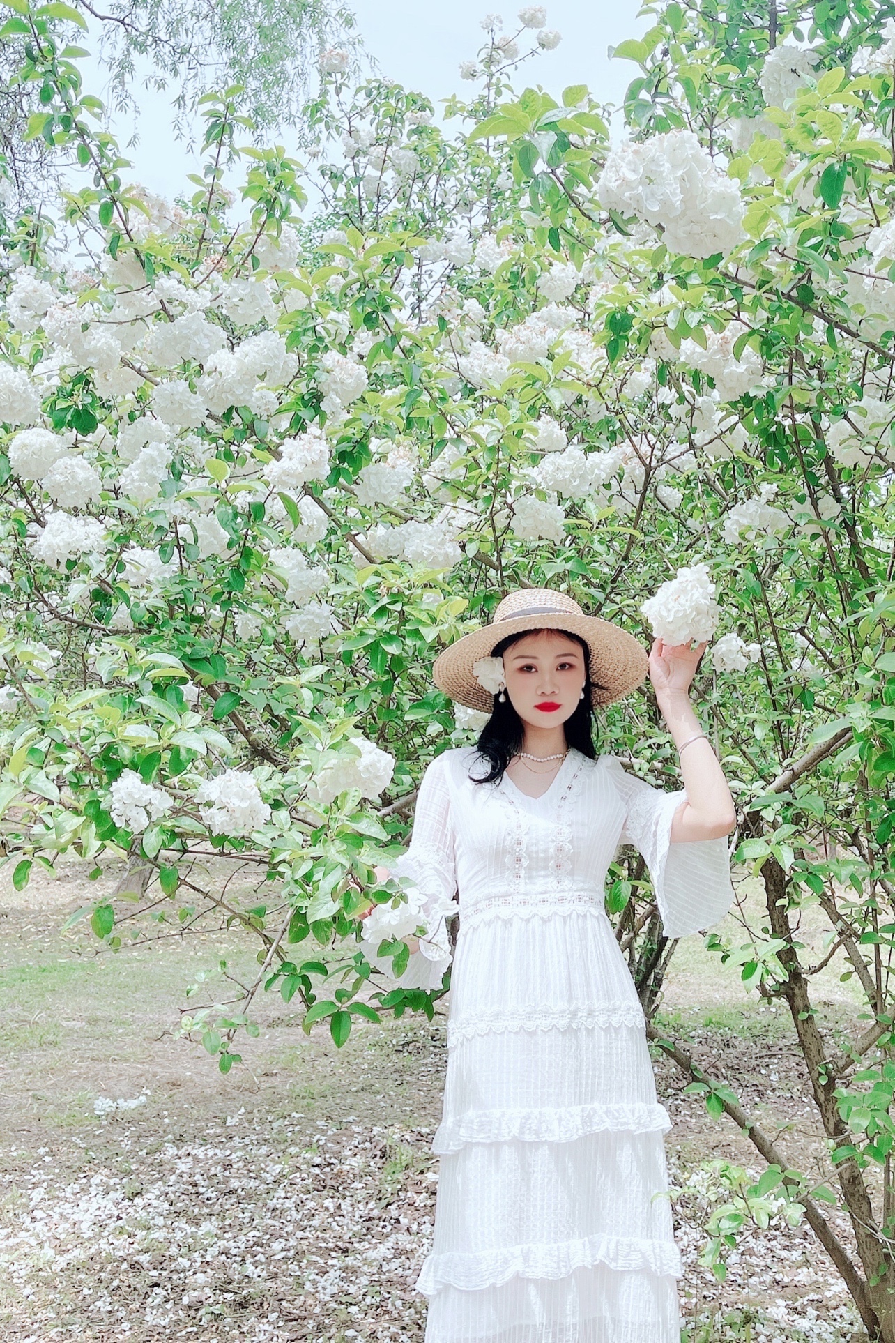 最近木绣球花大火,我也赶上了花期去拍了几张照片。手机拍摄,搭配白裙和绣球花呼应,很出片。