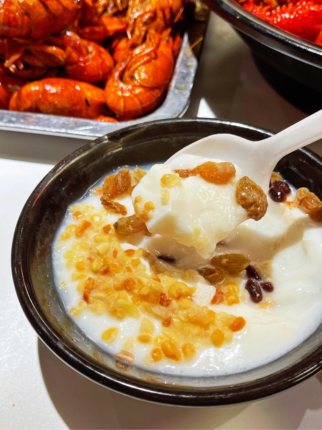 双皮奶是赠送的 但是完全可以单独出道了 味道超级好 和外面卖的不一样!口感细腻爽滑 而且还能拉丝 奶香味特别浓郁!还放了花生🥜碎、蜜红豆、葡萄干🍇等配料~