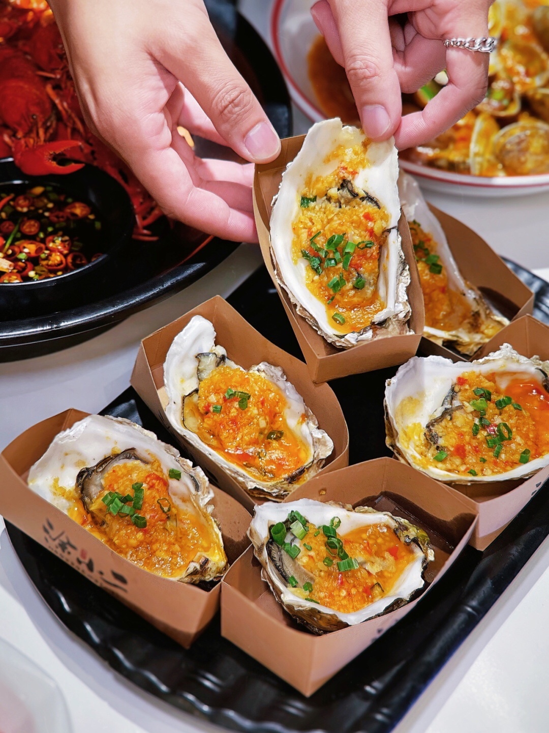 份量扎实 半打有六只 而且每只都贴心的用小盒子装着 以免被烫伤手!生蚝🦪被烤得鲜嫩多汁 上边的蒜蓉炒得很香 没有苦涩感!