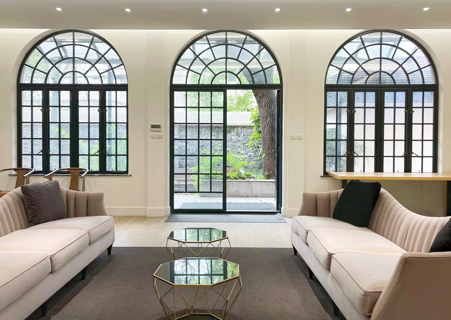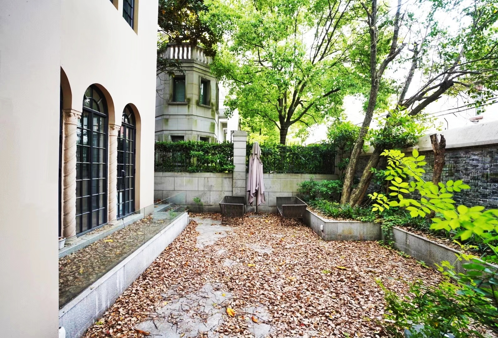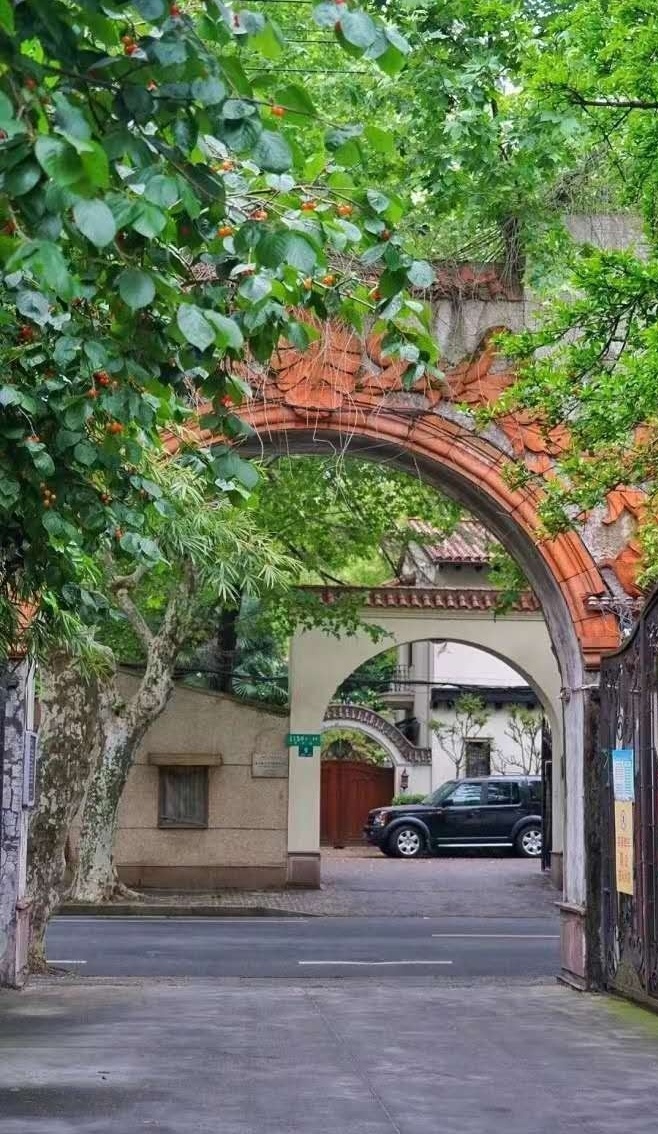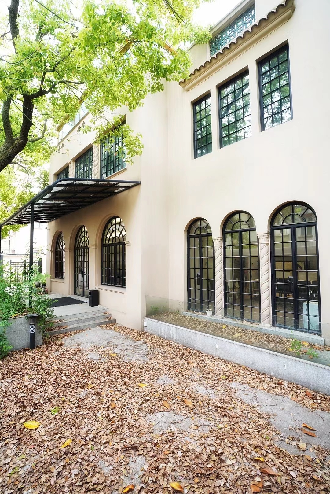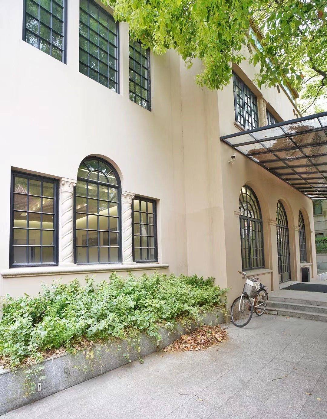 历史百年,香樟树点缀的院子,拱形窗户间的罗马柱,老房子的修旧如旧趁着古典与现代的美