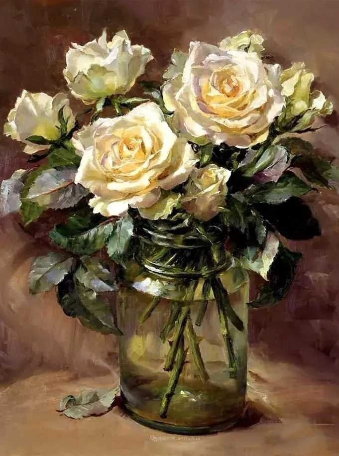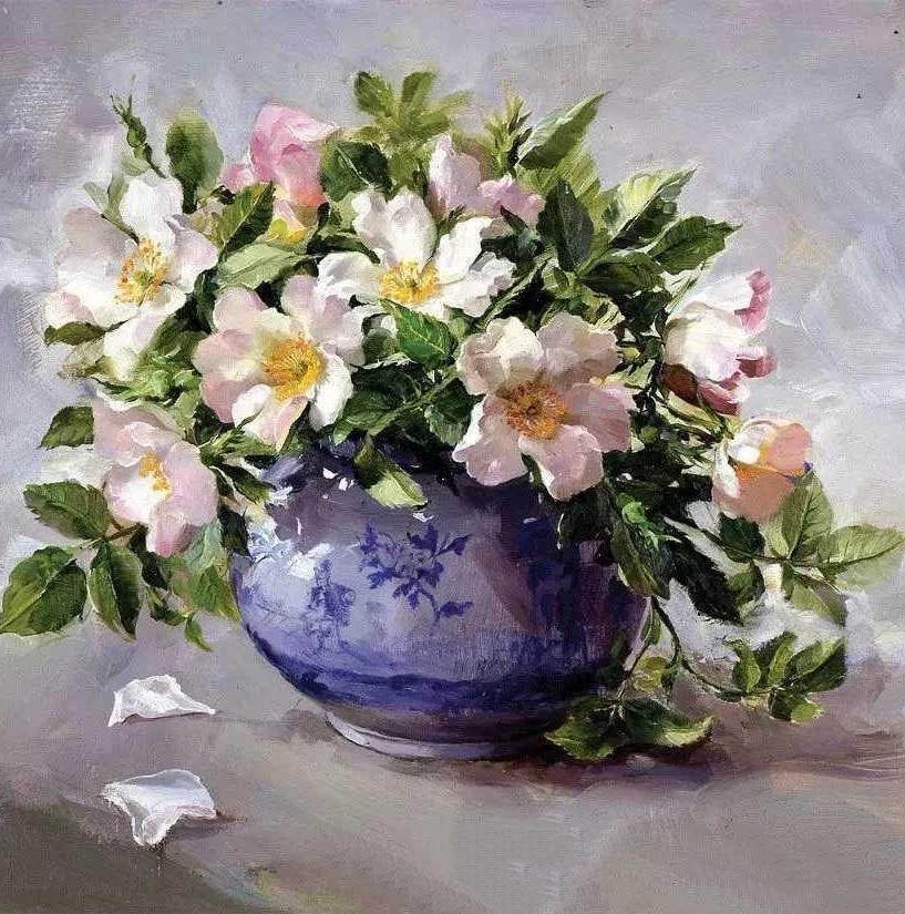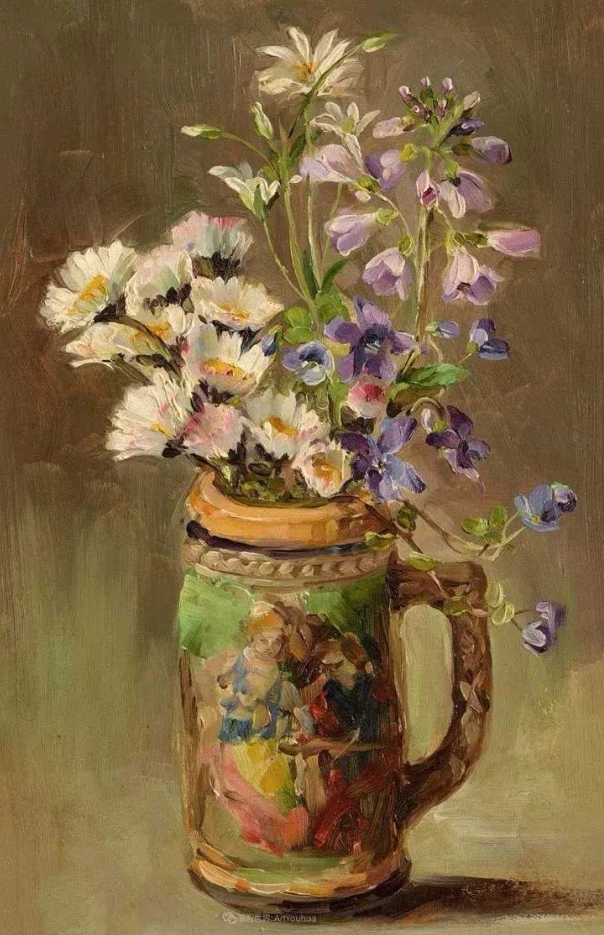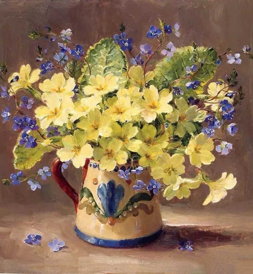 Anne Cotterill安妮·科特里尔,1933年出生于苏格兰边界,在爱丁堡接受教育,1956年毕业于爱丁堡艺术学院。她于2010年去世,是一个勤奋多产的英国画家。安妮奶奶是一个"花痴",因为世间万物,她只钟情画花。她对于色彩变化的敏感捕捉力赋予了这些静物油画中的花以独特的魅力~