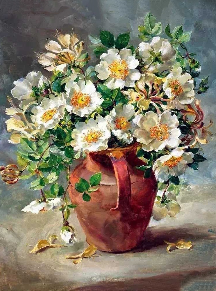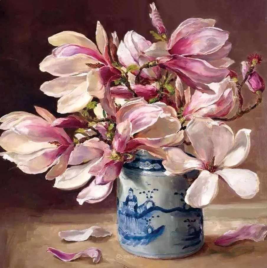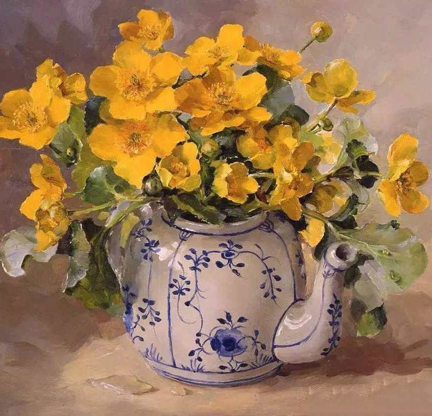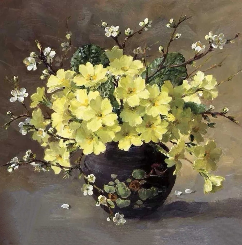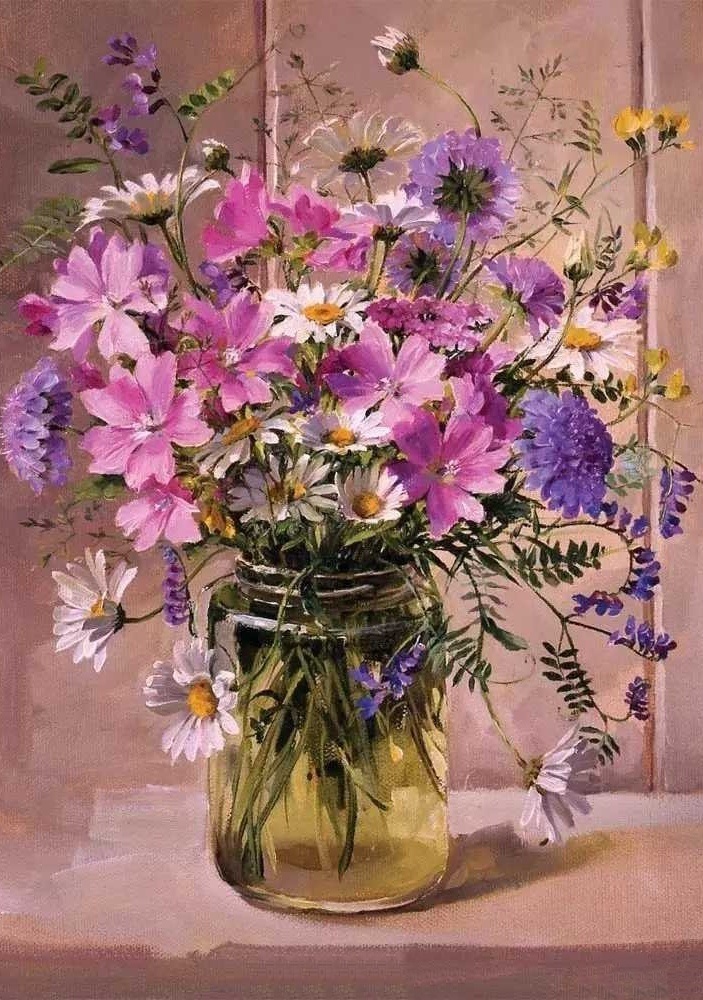 Anne Cotterill安妮·科特里尔,1933年出生于苏格兰边界,在爱丁堡接受教育,1956年毕业于爱丁堡艺术学院。她于2010年去世,是一个勤奋多产的英国画家。安妮奶奶是一个"花痴",因为世间万物,她只钟情画花。她对于色彩变化的敏感捕捉力赋予了这些静物油画中的花以独特的魅力~
