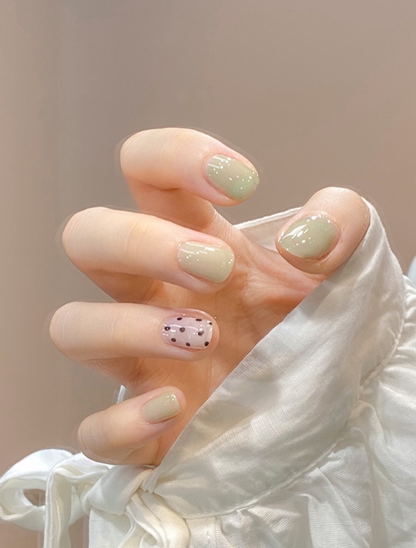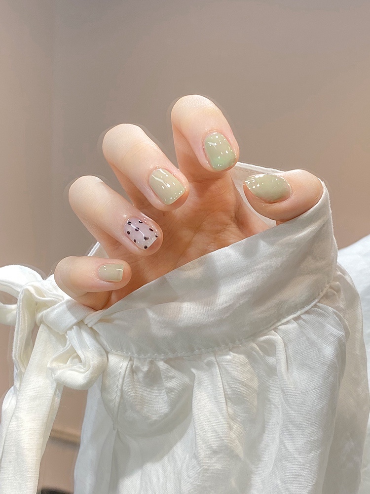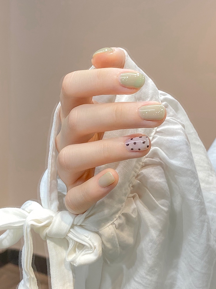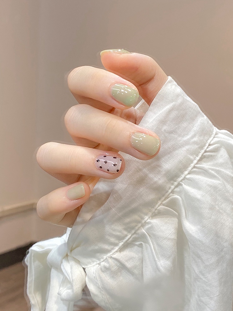 夏天到了,再涂深色,总觉得没有那么搭,立马找浅色涂涂,用的是萌芽的浅绿色的,非常可爱哒!无名指做的冰透乳白黑色波点跳色甲,让指尖更加精致了