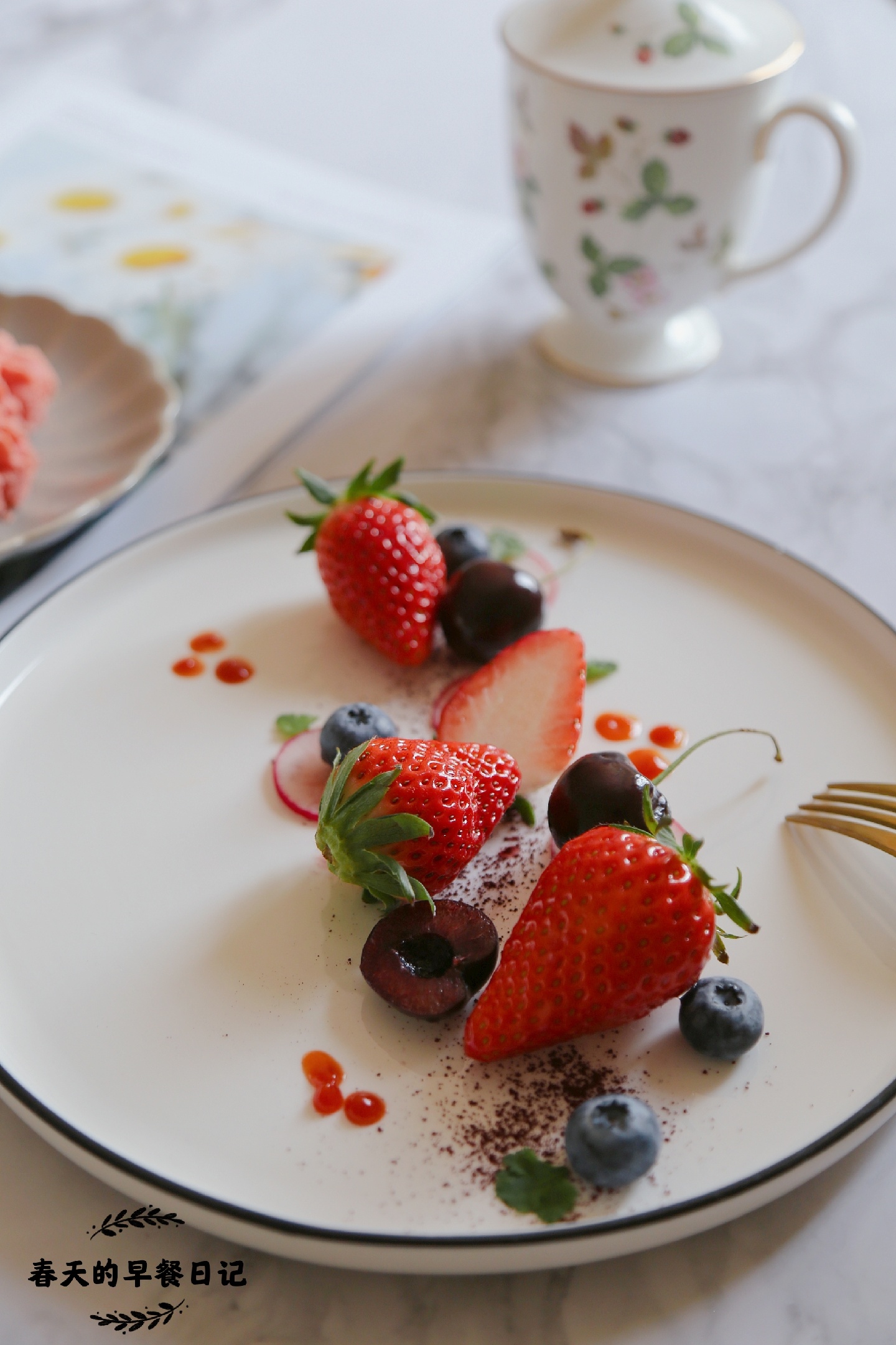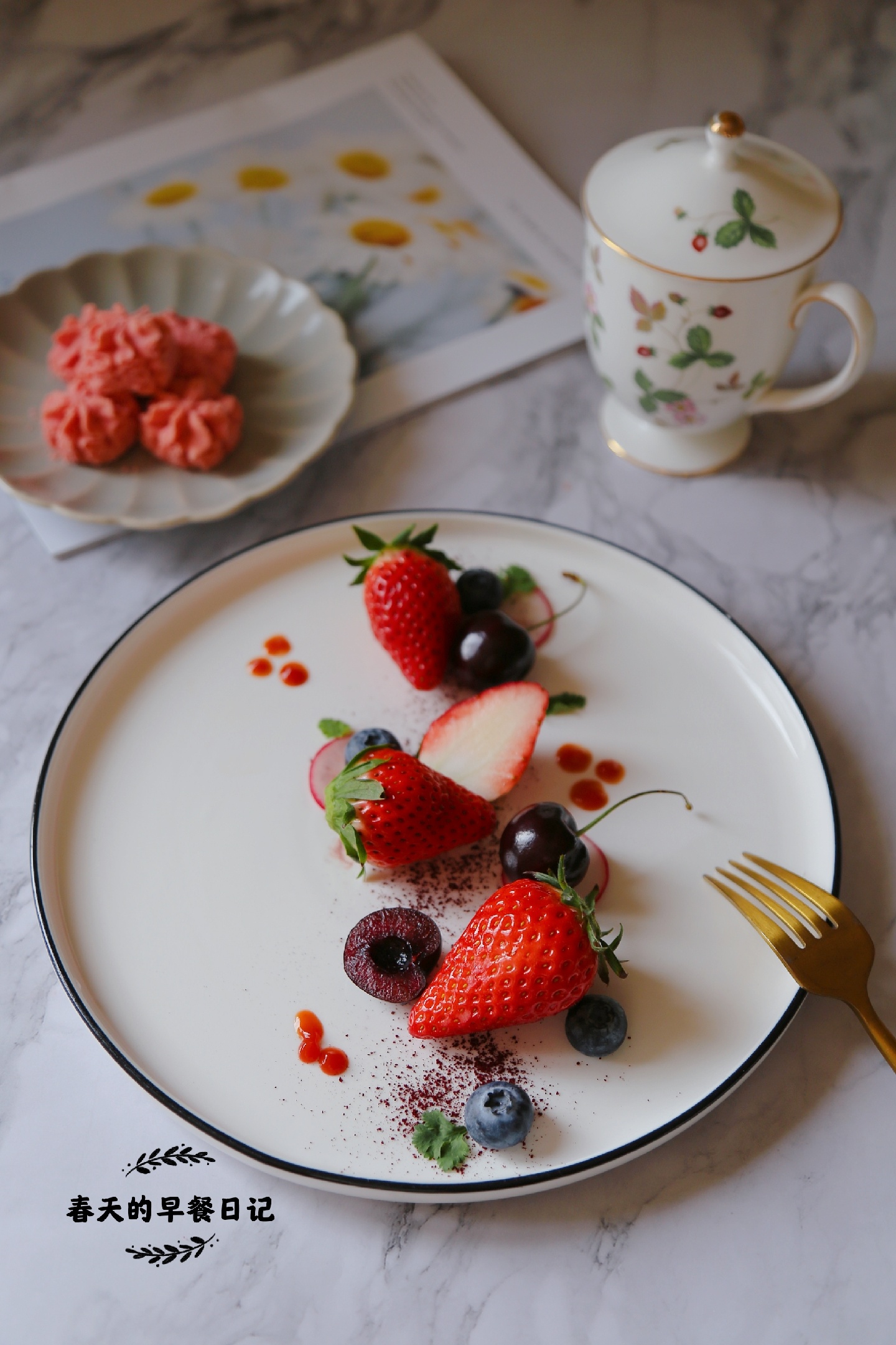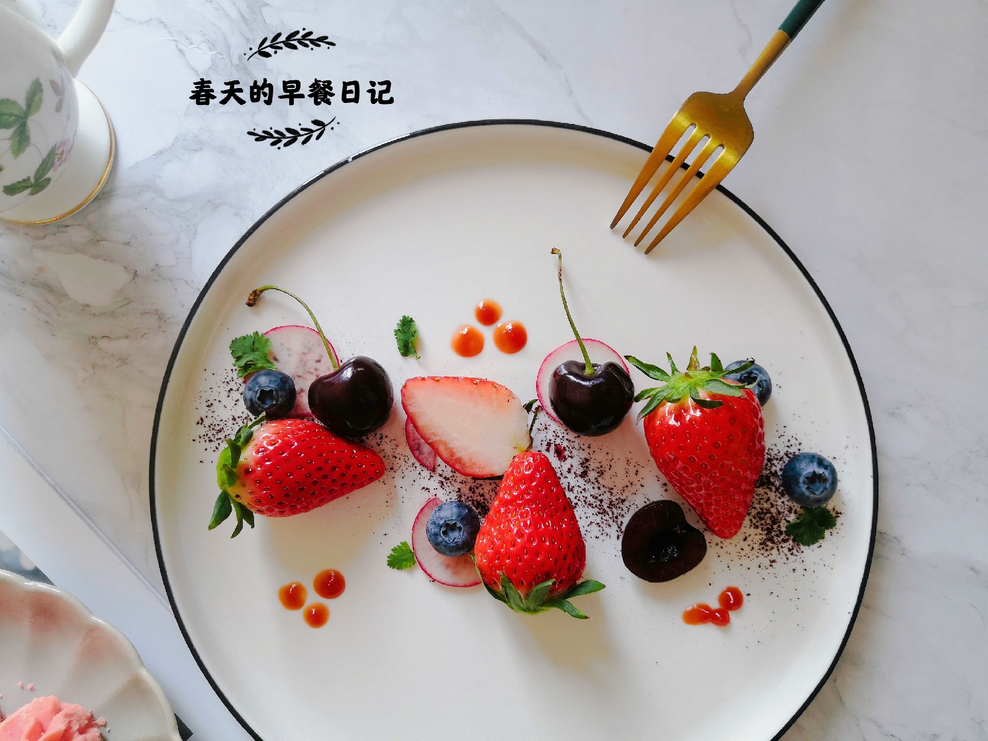 一看就会的米其林摆盘,也不需要特殊工具,用到草莓,蓝莓,车厘子,小红萝卜,装饰用的是番茄酱和甜菜根粉。家里没有薄荷了,用香菜叶充数吧,哈哈。