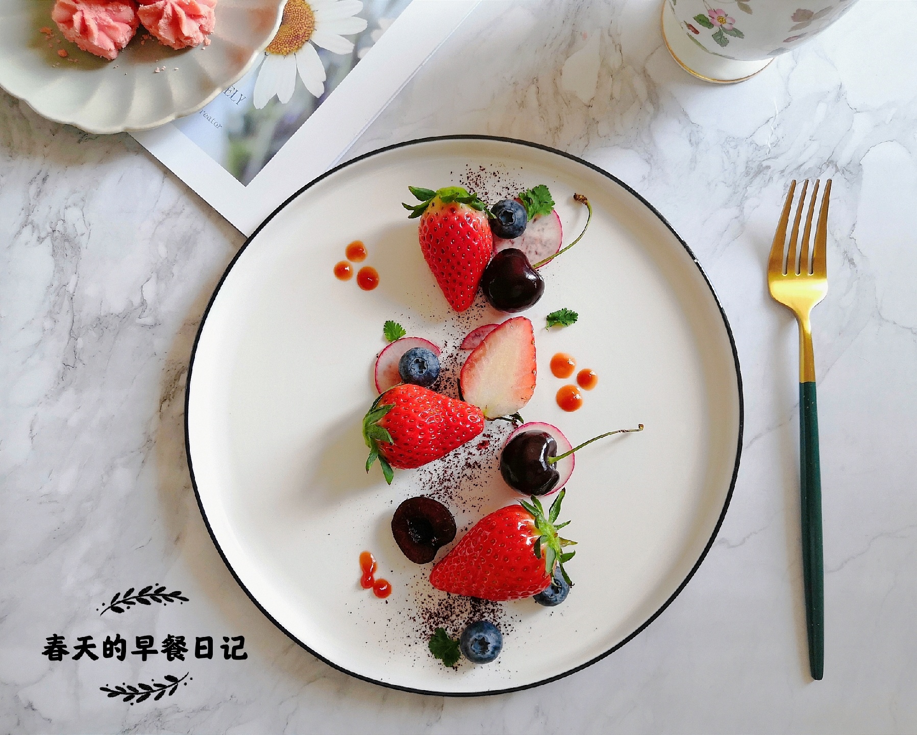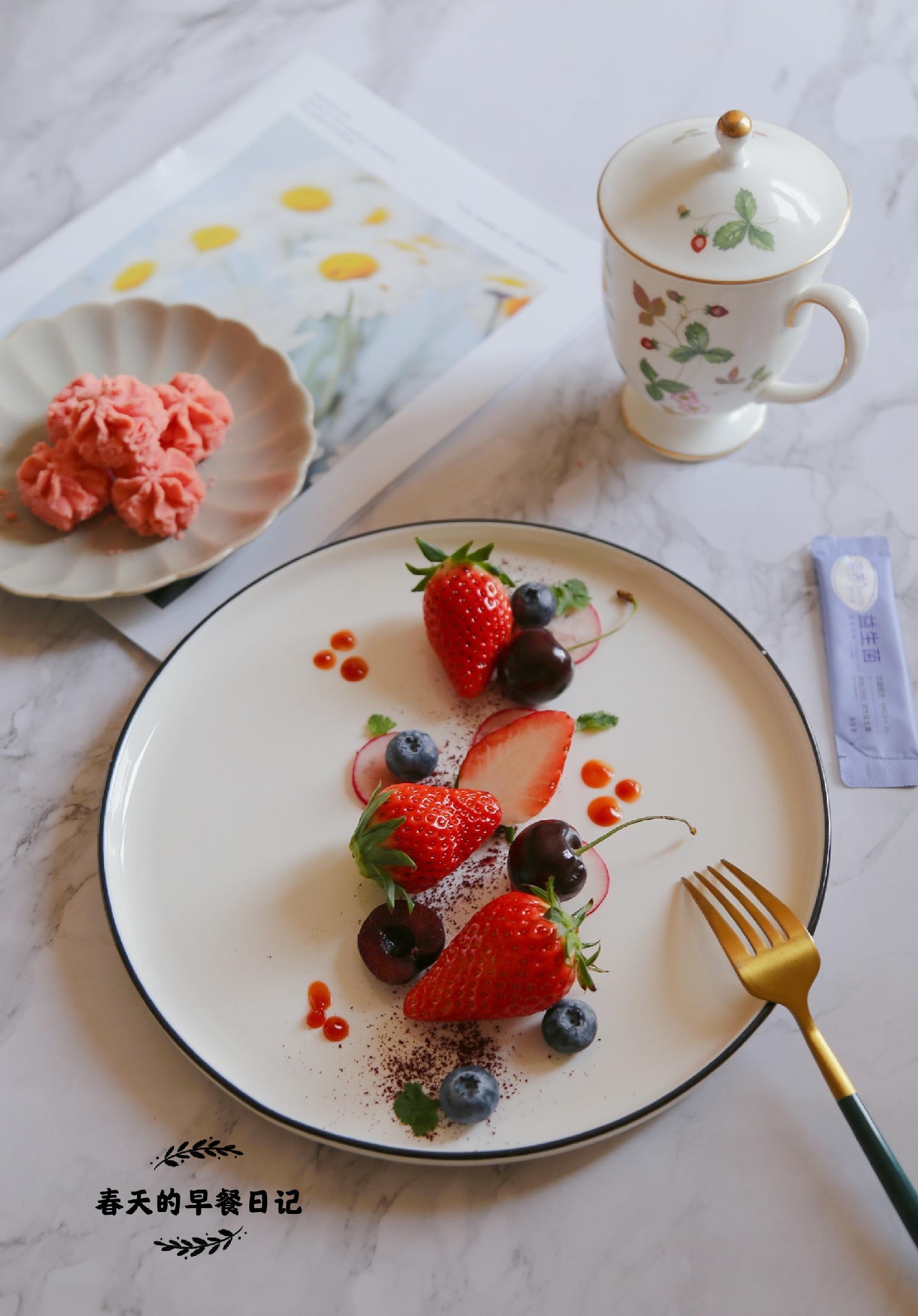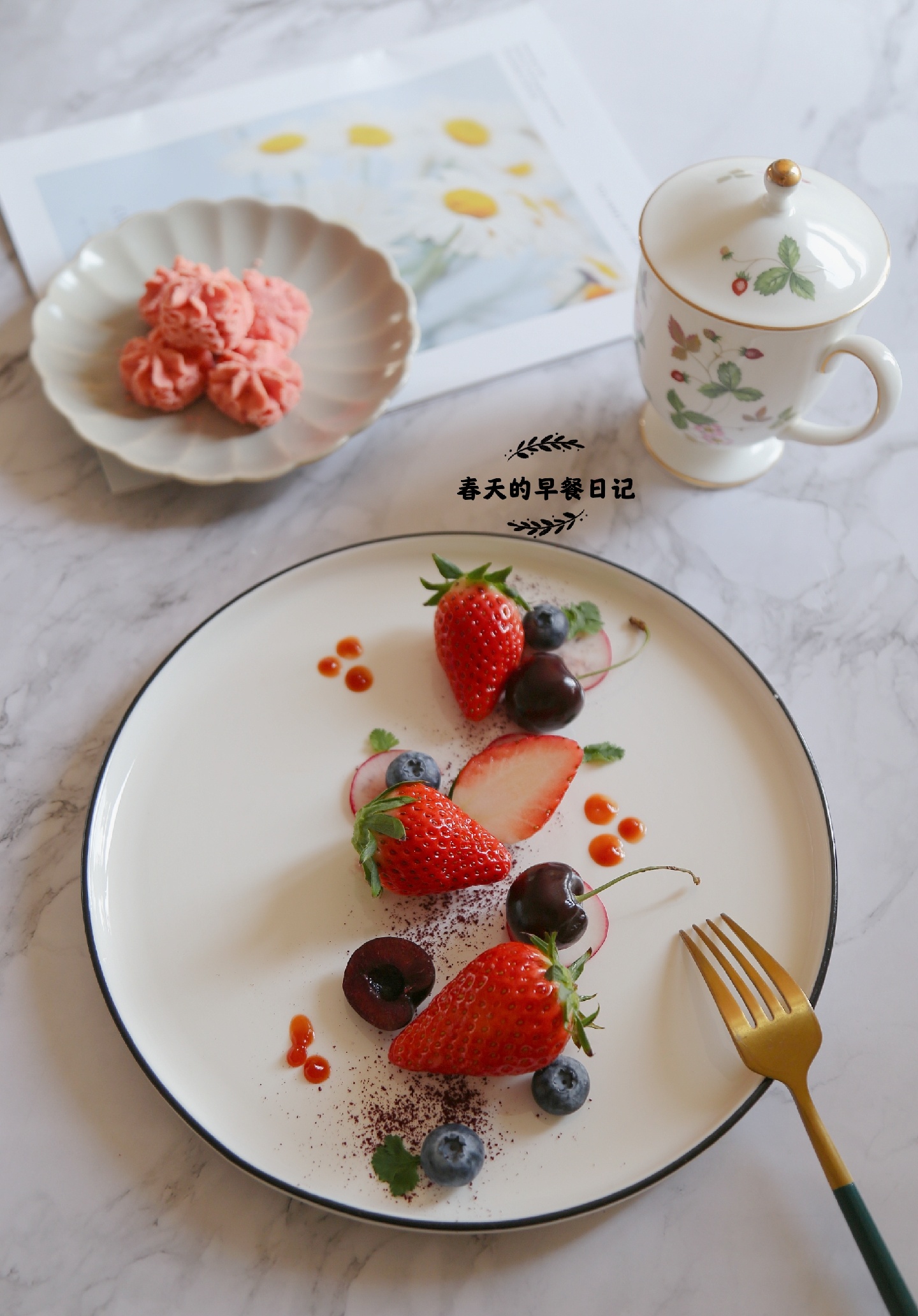 一看就会的米其林摆盘,也不需要特殊工具,用到草莓,蓝莓,车厘子,小红萝卜,装饰用的是番茄酱和甜菜根粉。家里没有薄荷了,用香菜叶充数吧,哈哈。