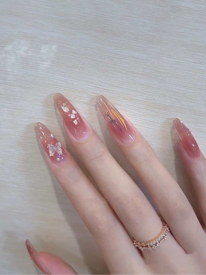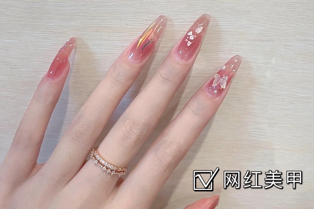 甜桃果冻✨清透感贝壳小蝴蝶玻璃美甲💅