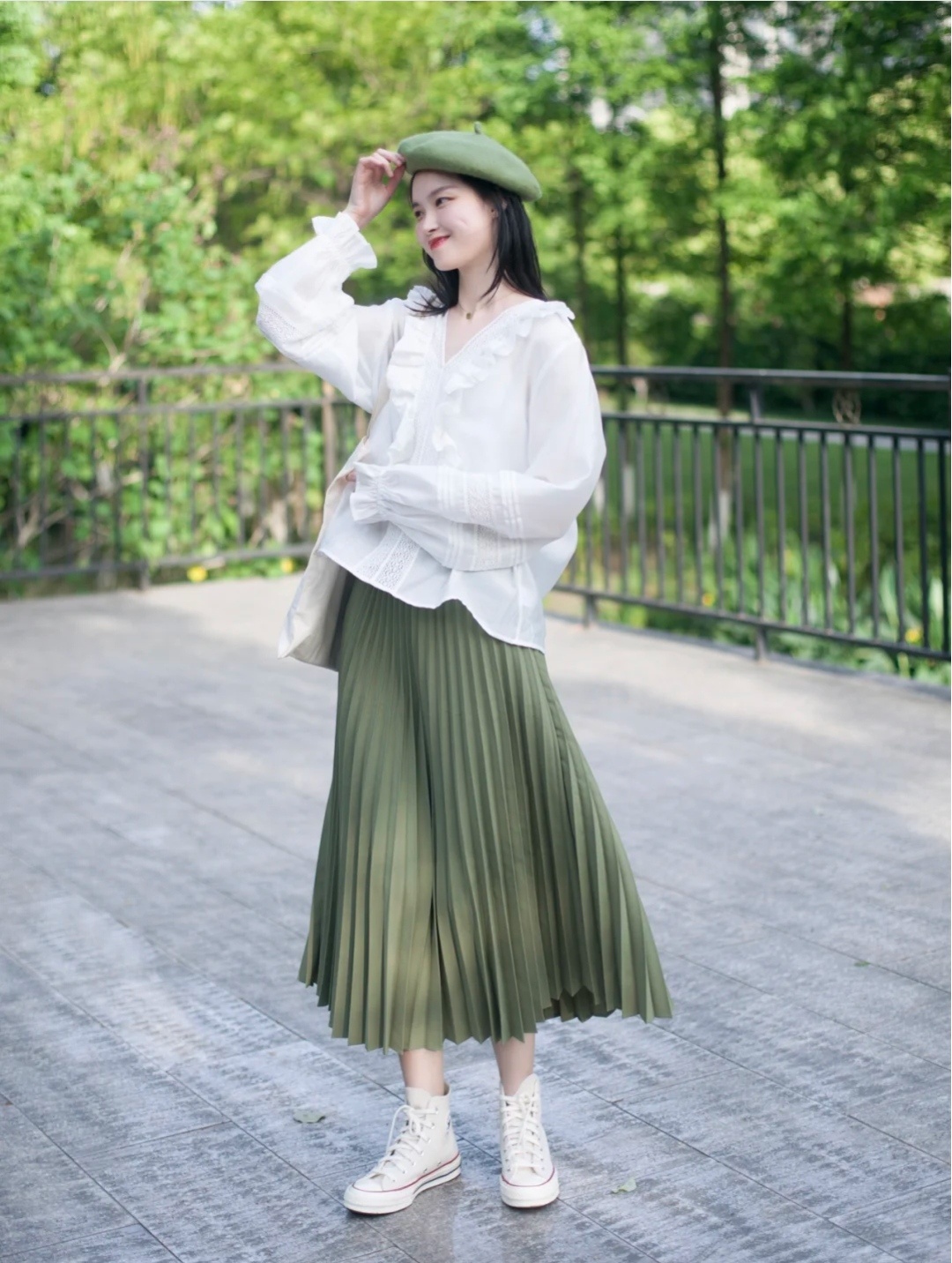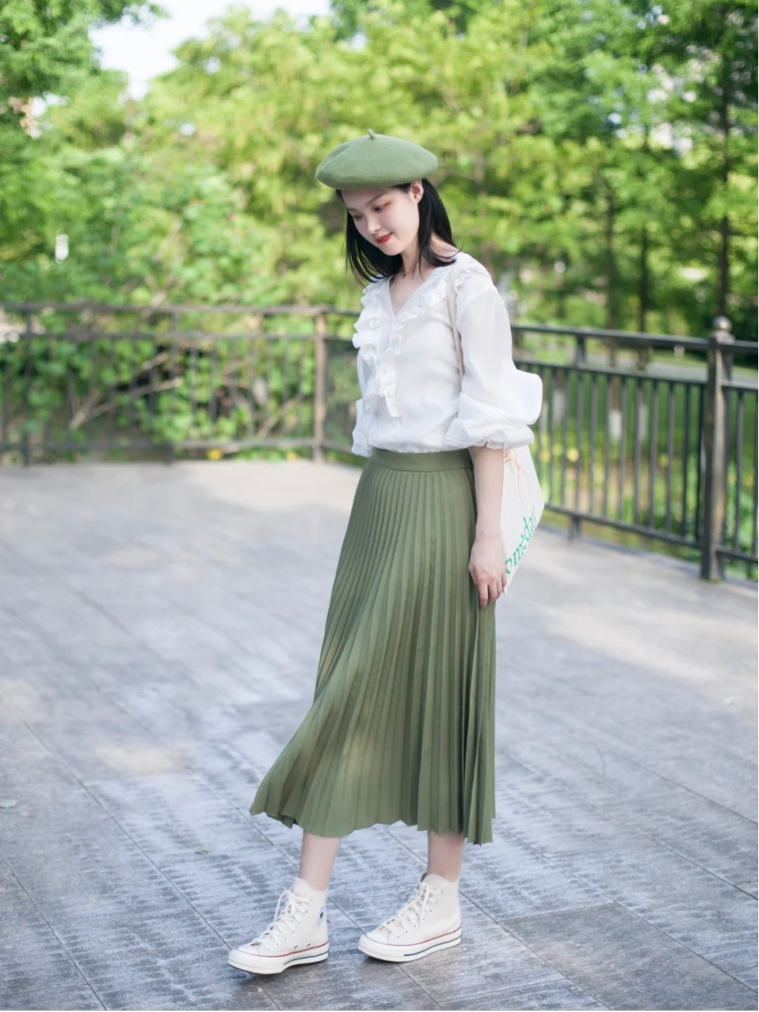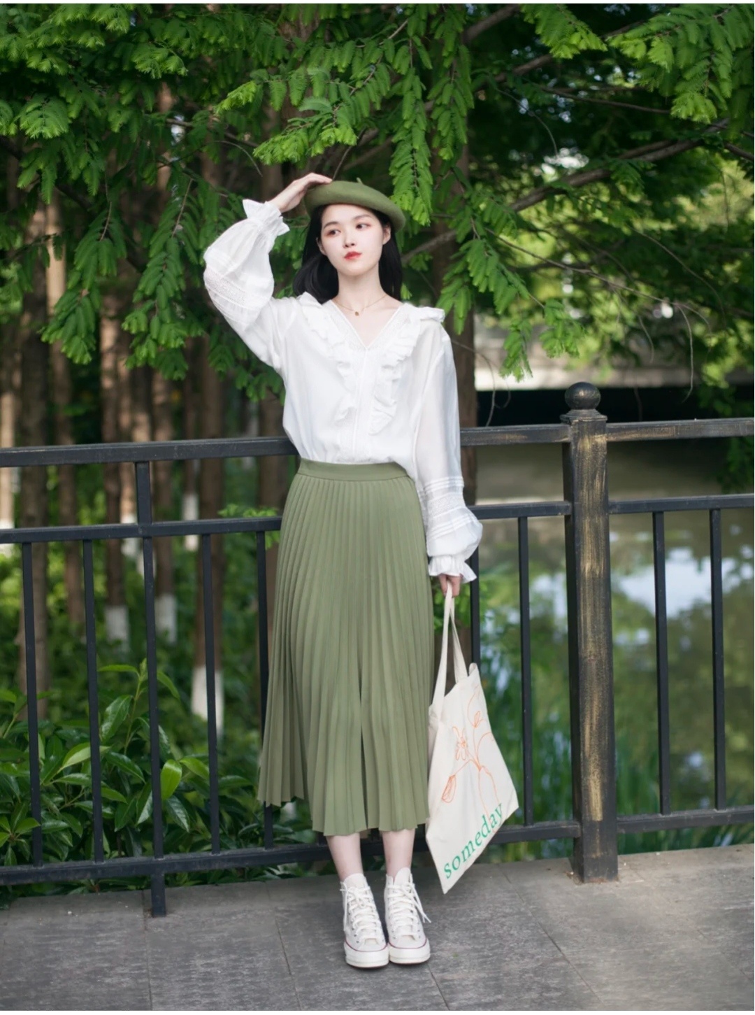 白色衬衫十绿色半身裙的搭配看着太舒服了