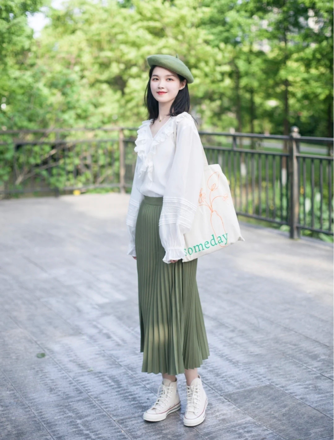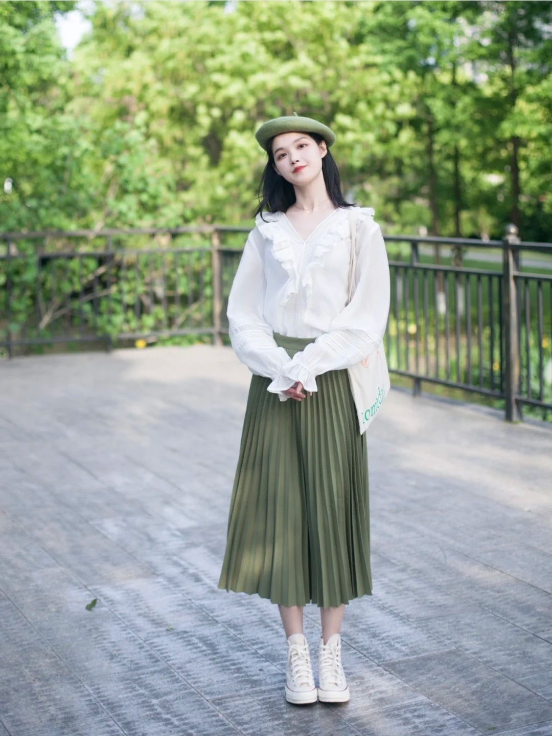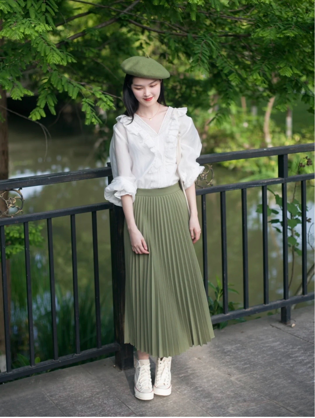 白色衬衫十绿色半身裙的搭配看着太舒服了