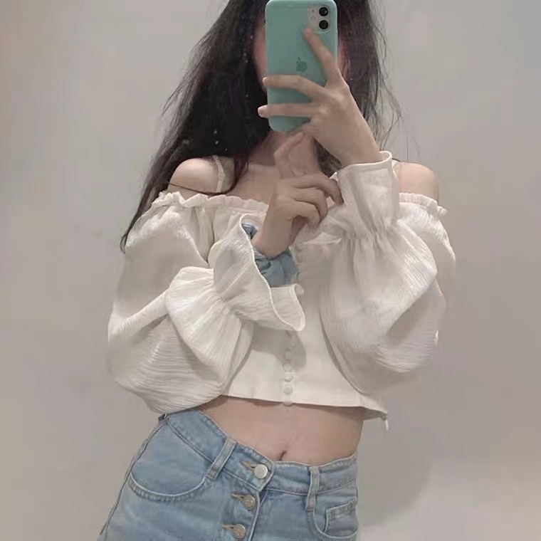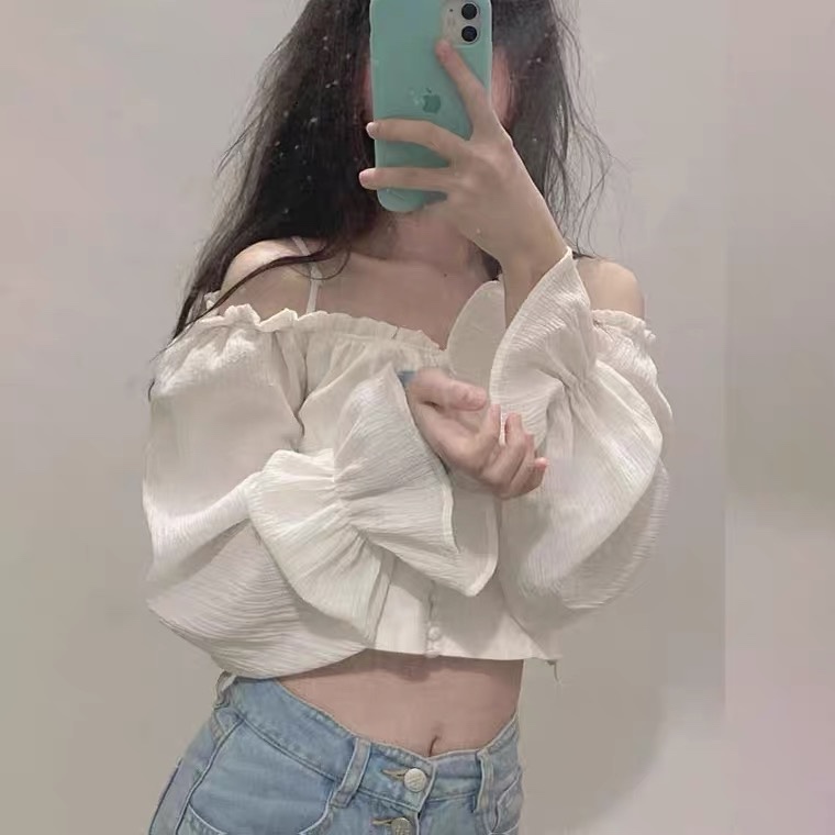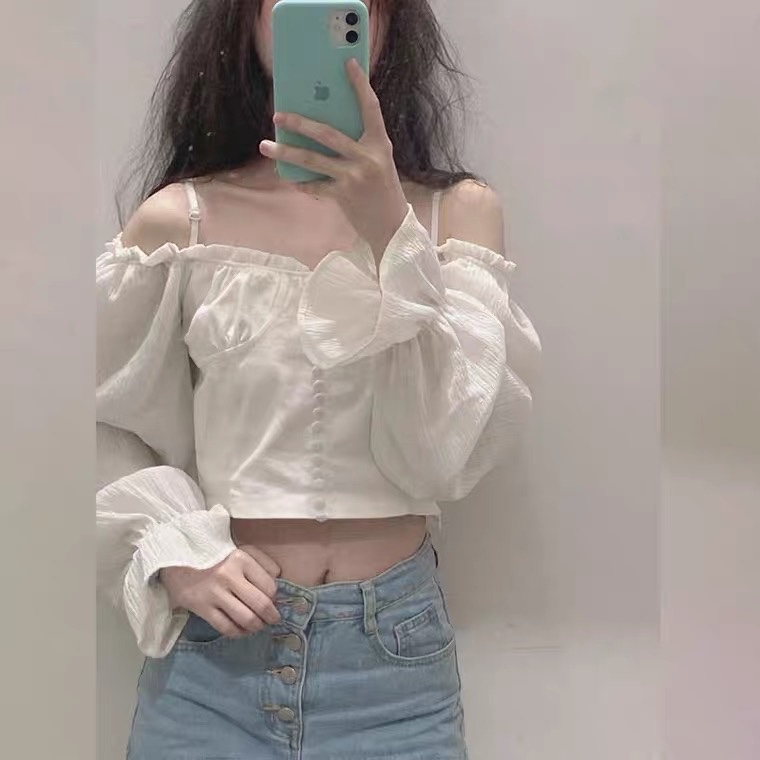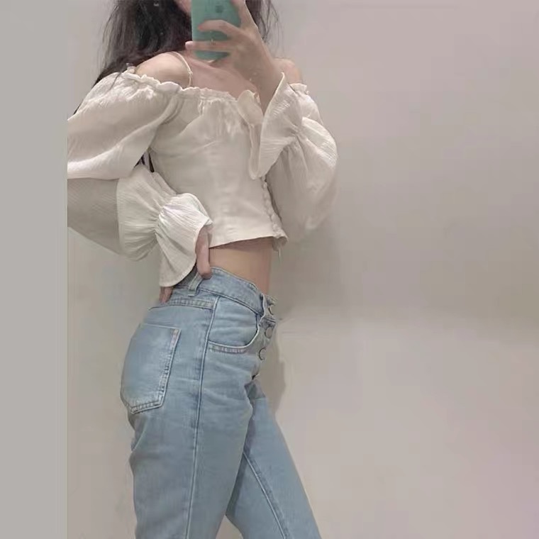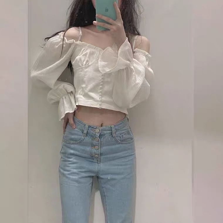 今日穿搭💜|露肩白色短款上衣+浅色牛仔裤