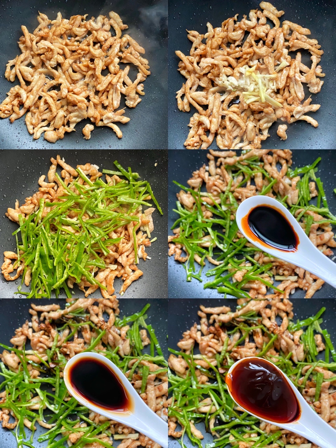 3️⃣锅中加入适量油,放入鸡胸肉翻炒变色表面微黄,加姜蒜末炒香,放青椒翻炒,加蚝油一勺,生抽一勺,老抽半勺翻炒均匀出锅。