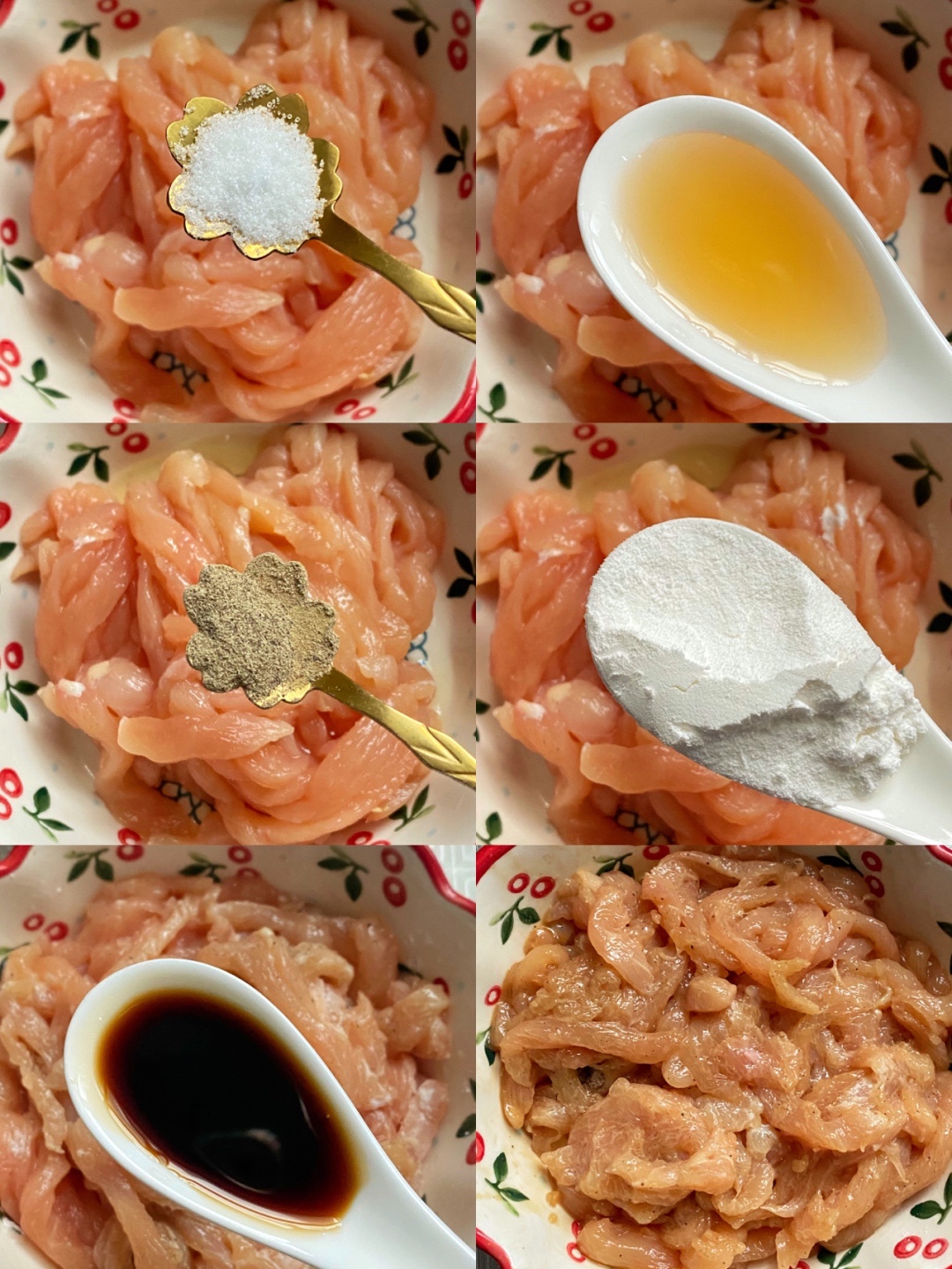 2️⃣鸡胸肉丝,加料酒一勺,生抽一勺,淀粉一勺,盐和黑胡椒适量,抓均匀腌制10分钟