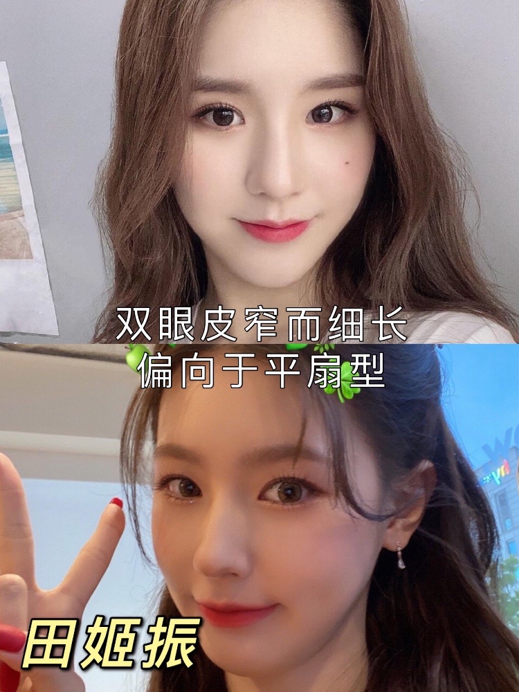 眉眼间距比田姬振宽一些,她的双眼皮宽度也宽一些,眼型为开扇型,眼睛偏圆,眼球完全暴露,眼睛大而有神。适合大多数妹子。