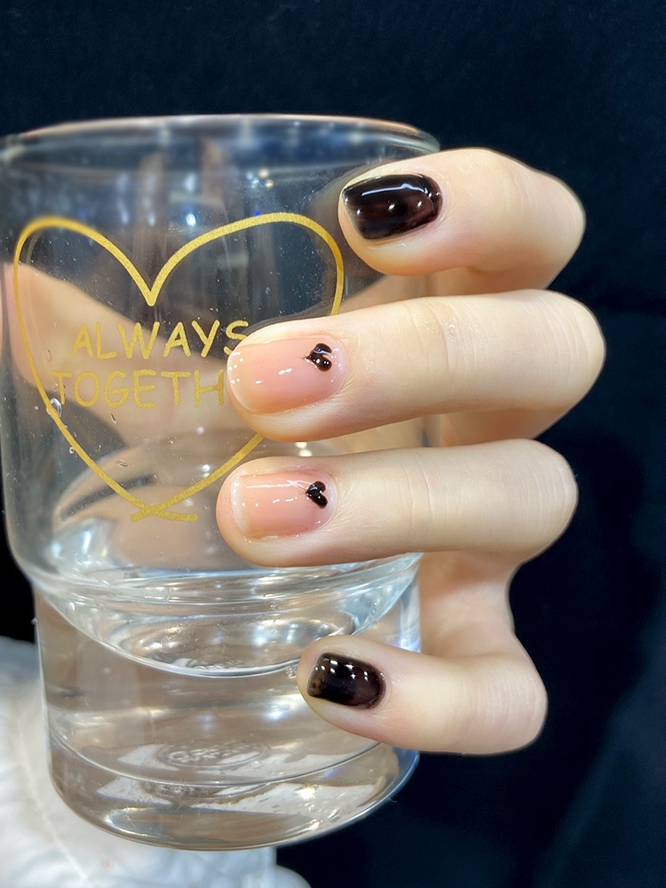 黑色美甲搭配裸粉色的美甲,十分可爱,配色也太软妹了吧,质地很温柔,裸粉色上搭配手绘黑色爱心🥰,哇哦,真的是好喜欢💕 温柔又气质