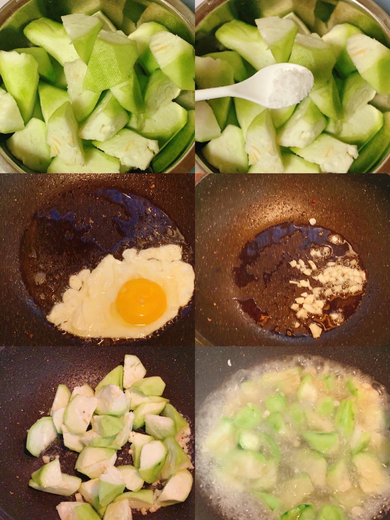 2️⃣起锅热油煎熟鸡蛋,留着底油爆香蒜末,倒入丝瓜炒软
