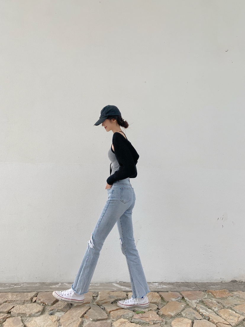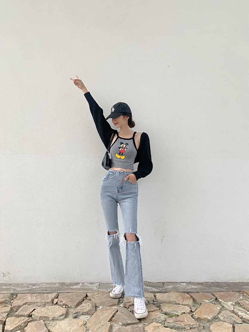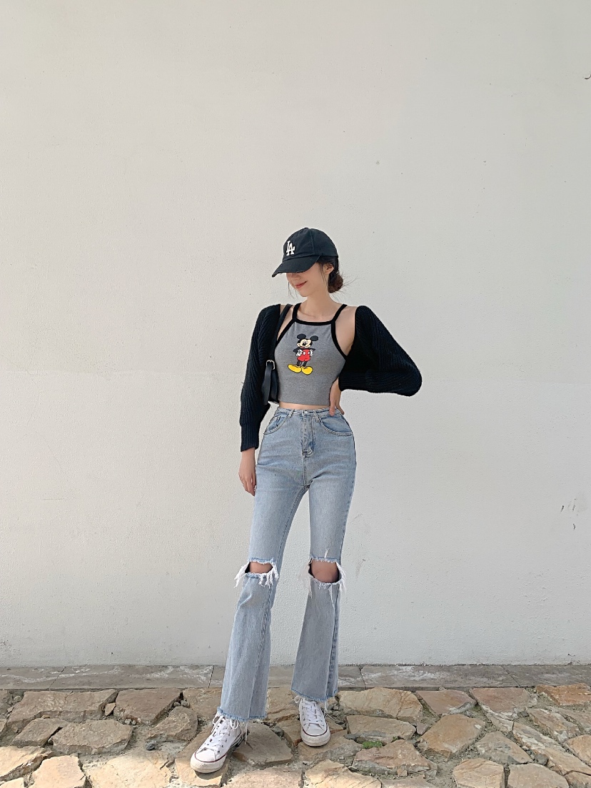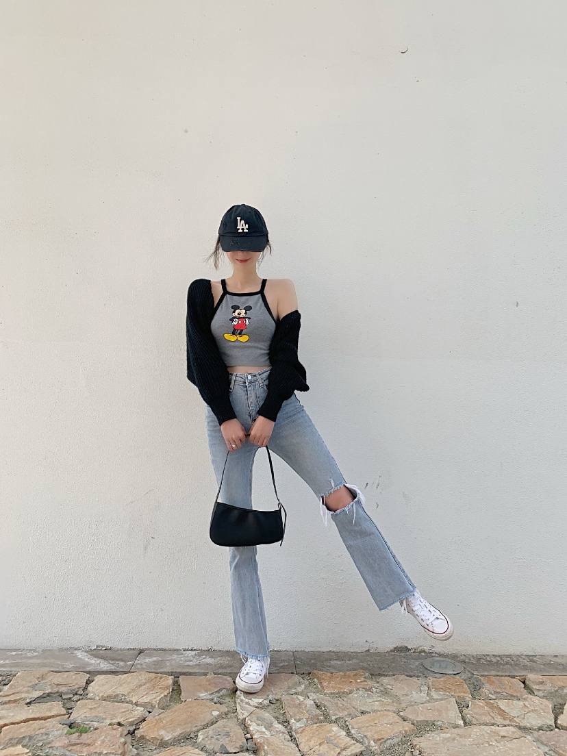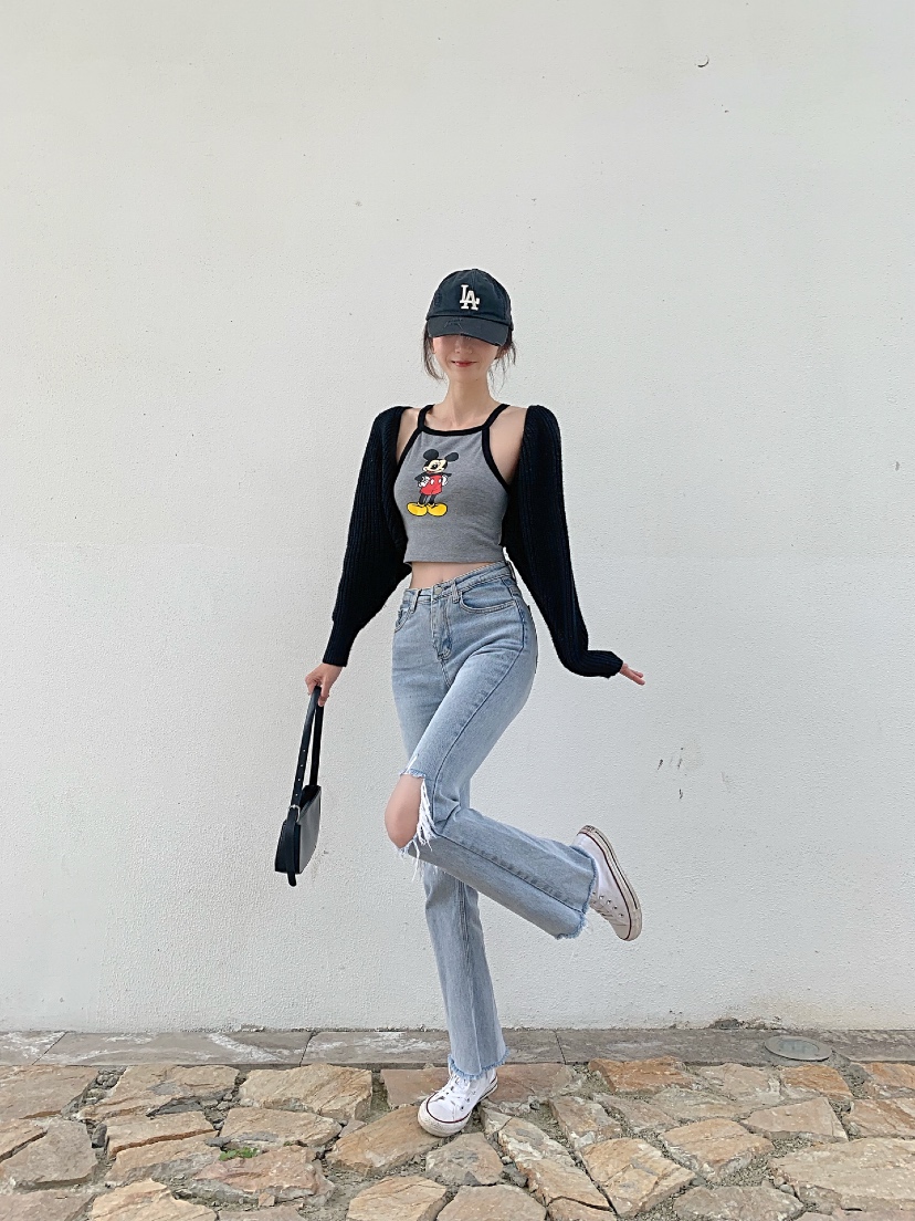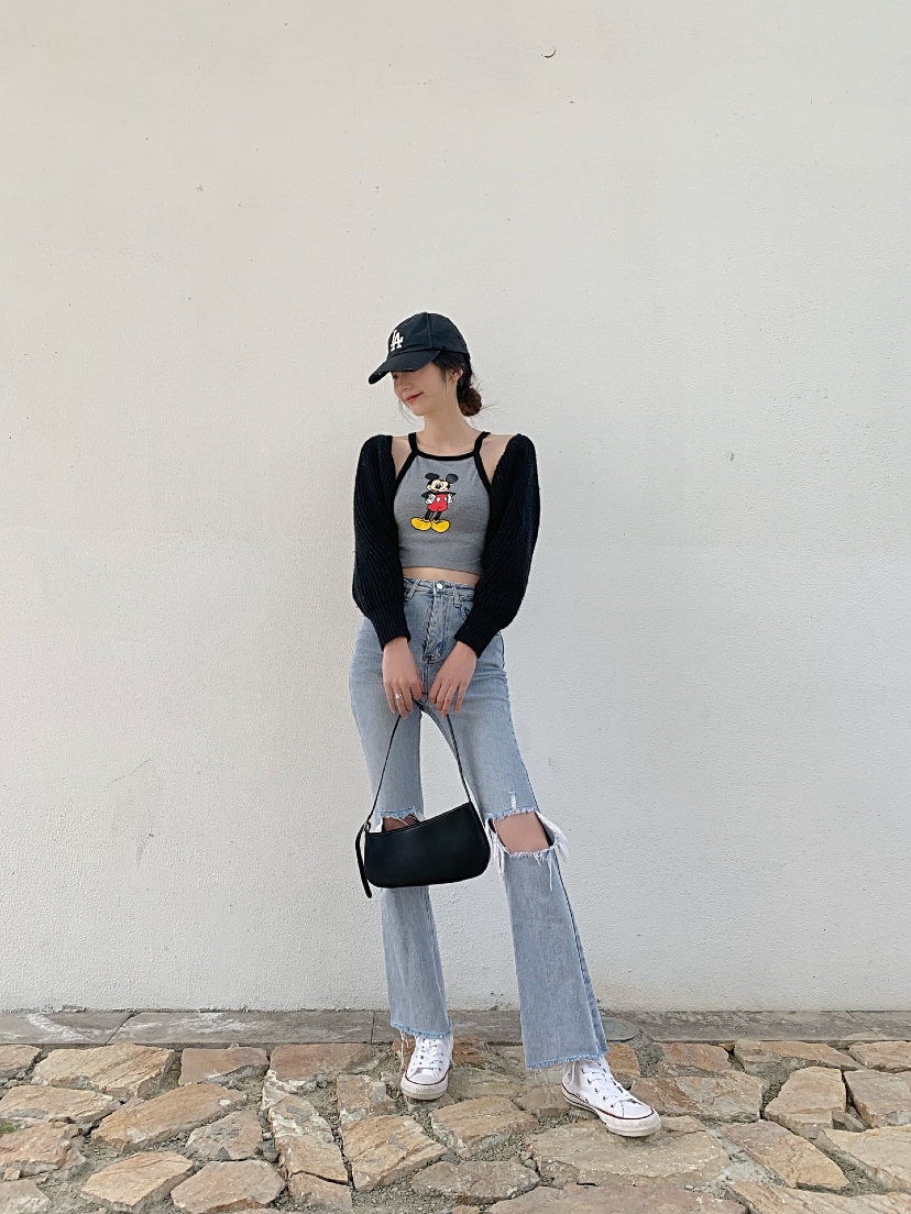 米奇吊带➕针织披肩➕牛仔裤➕帆布鞋➕鸭舌帽➕斜挎包