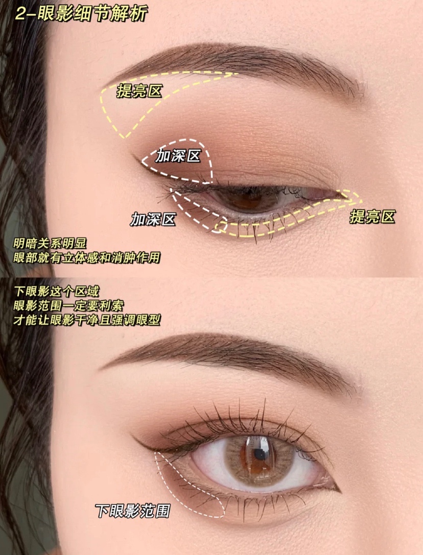 浅哑光色眼影打底,慢慢叠加更深色的哑光色