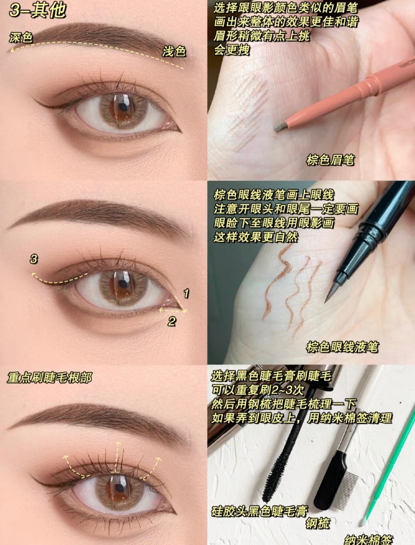 哑光深色画全包式眼脸下至眼线,加深卧蚕阴影