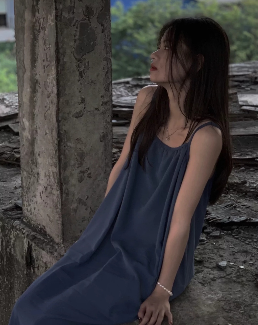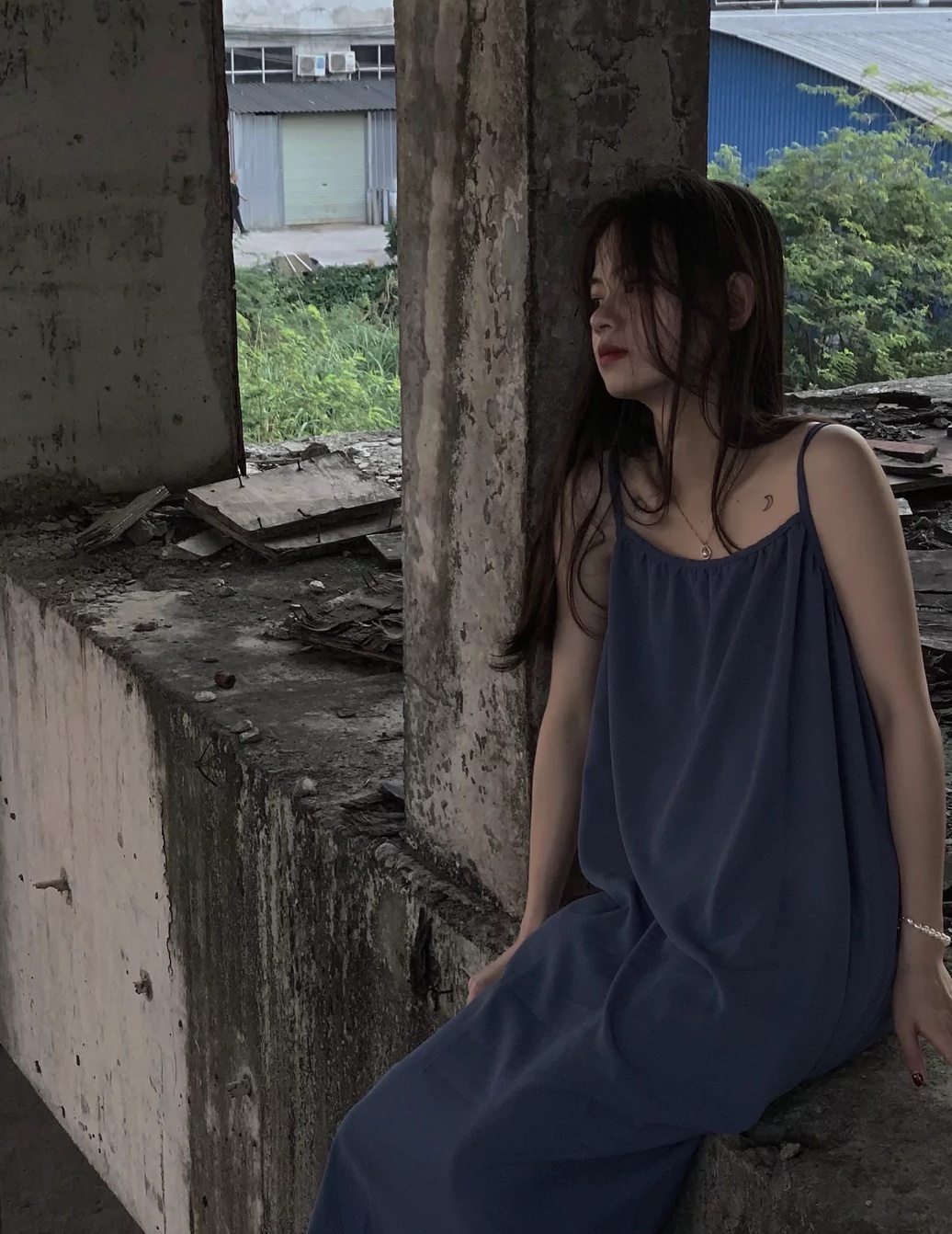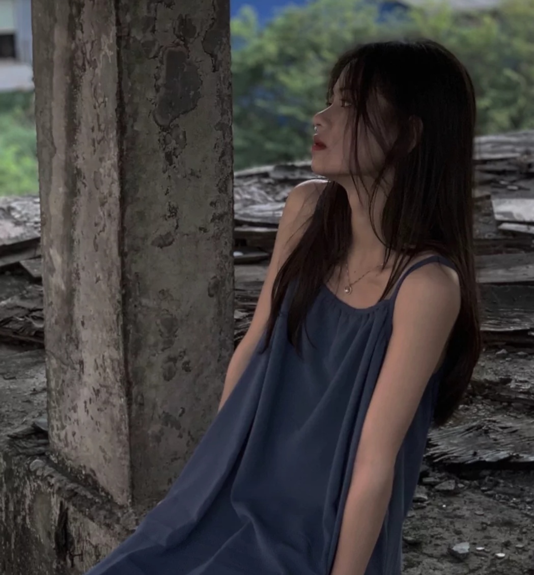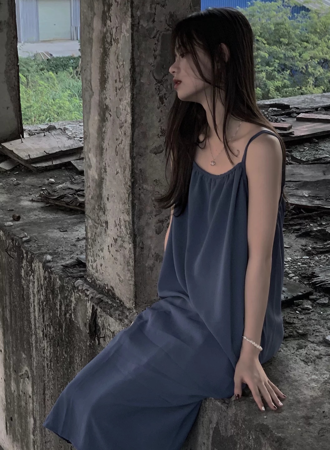 蓝色吊带长裙加蓬松凌乱的头发