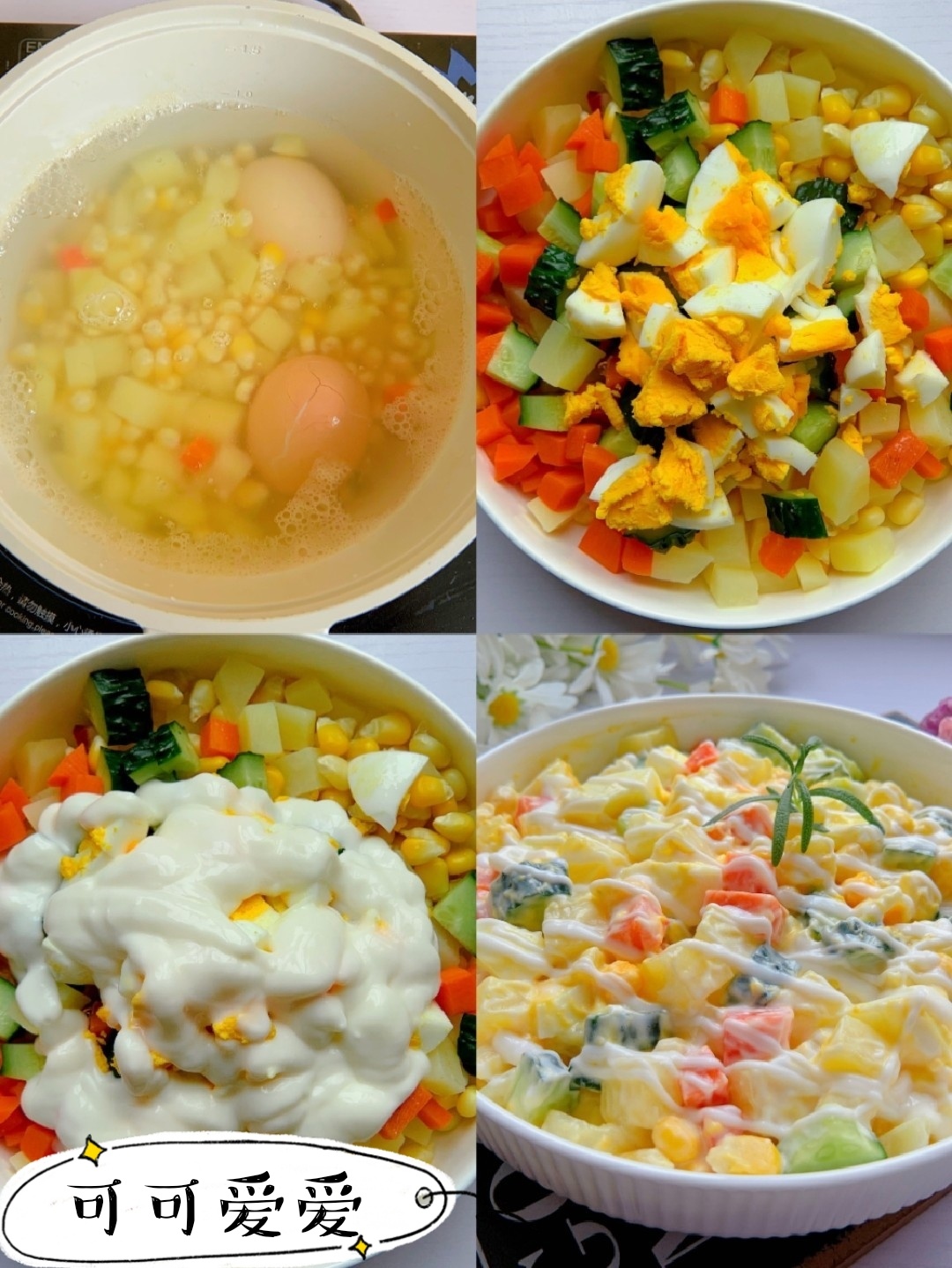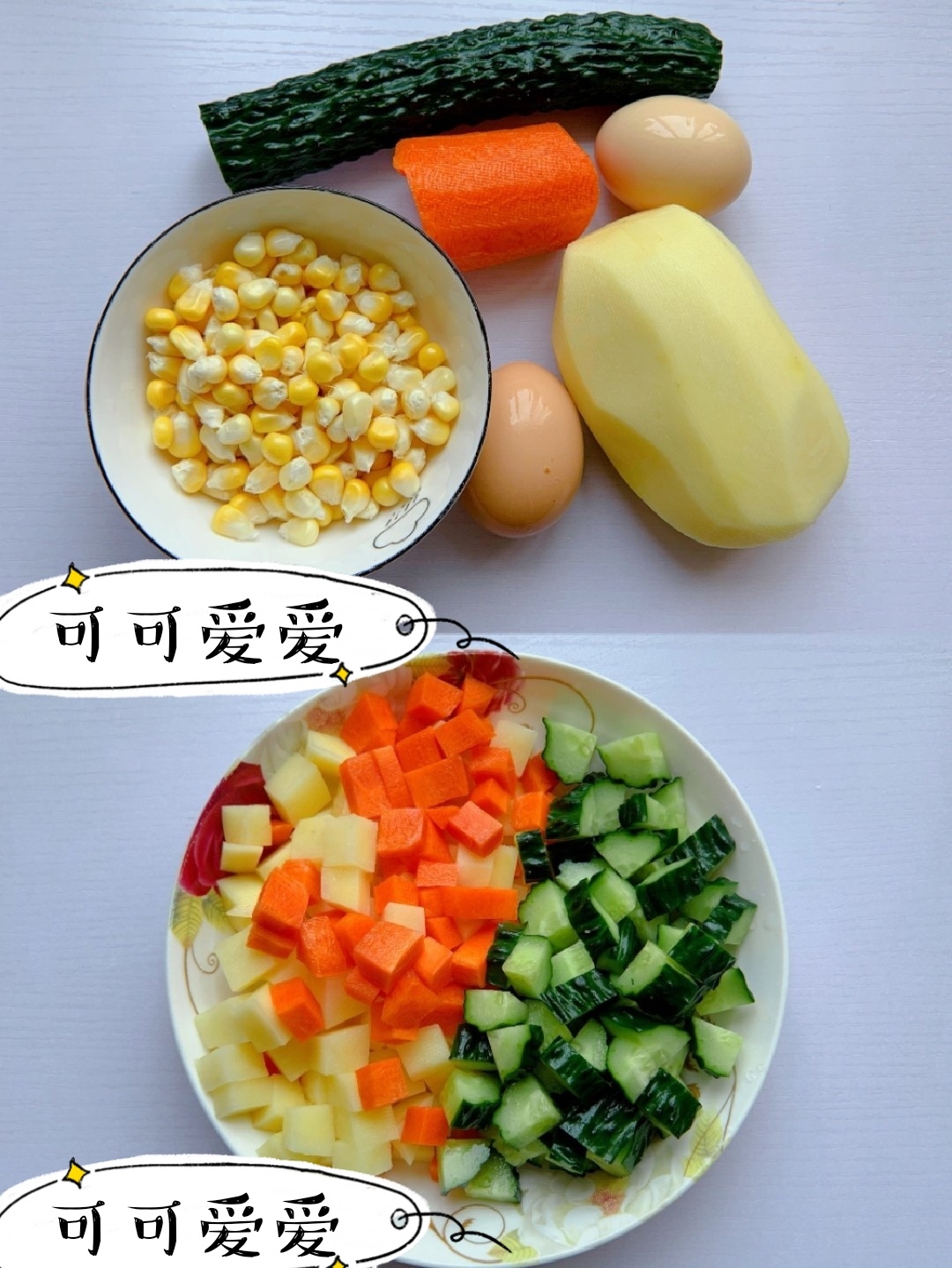 鸡蛋两个,黄瓜半根,土豆半个,胡萝卜一小段,甜玉米适量,酸奶100ml