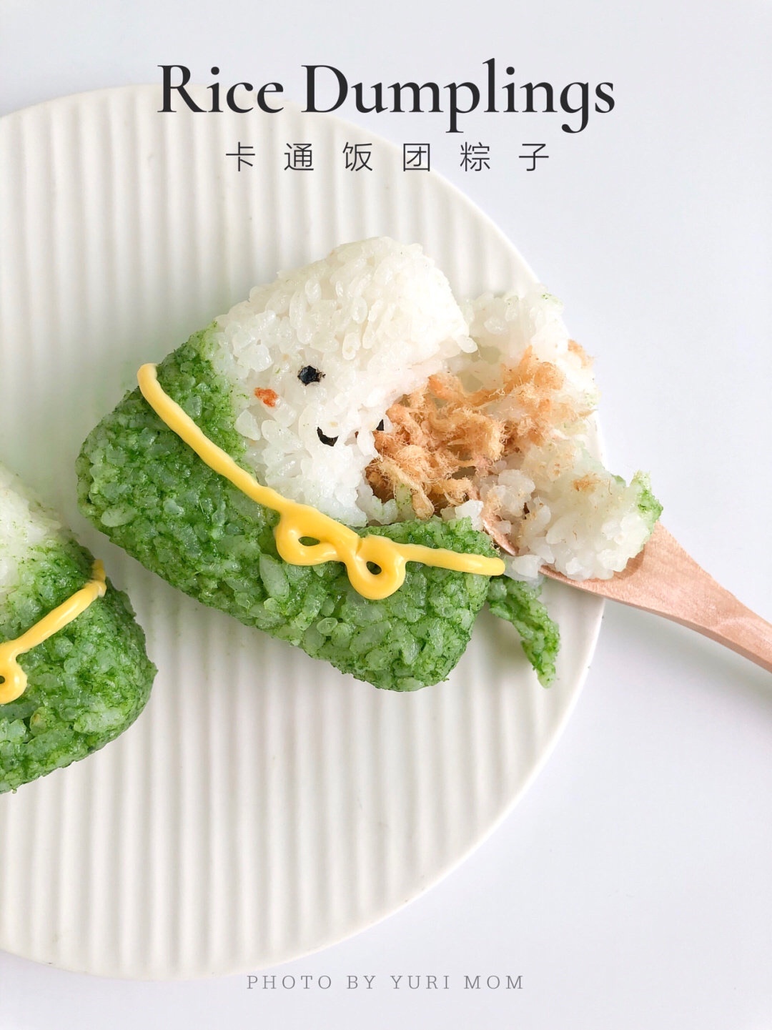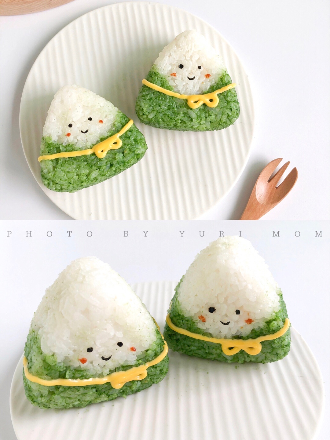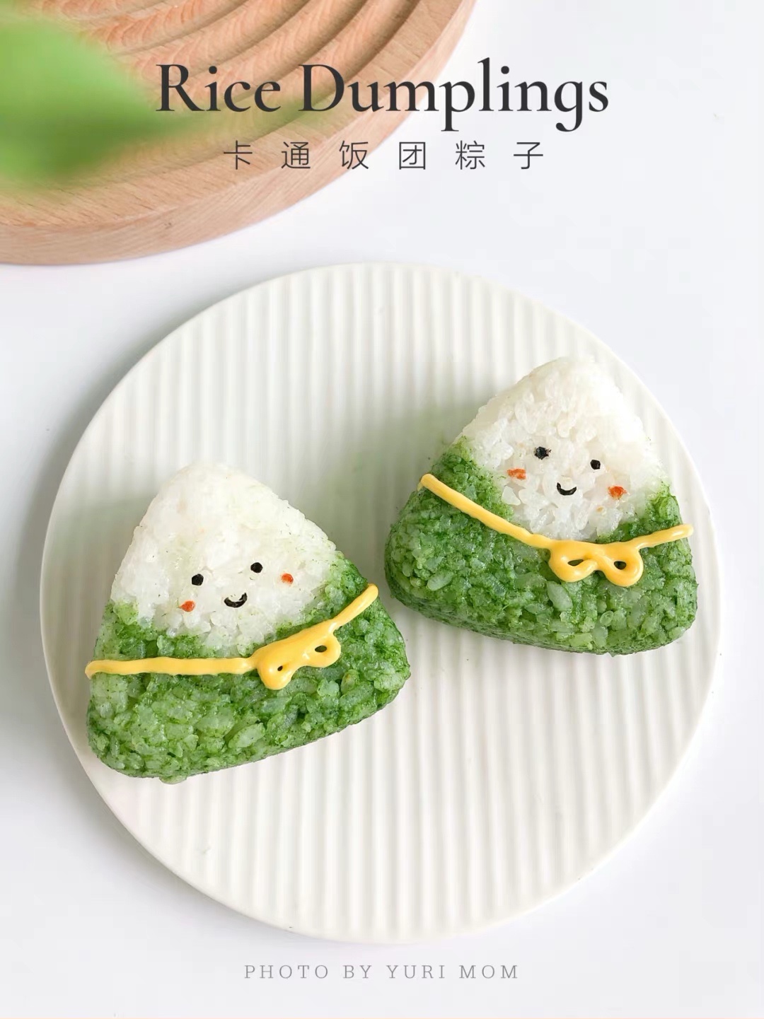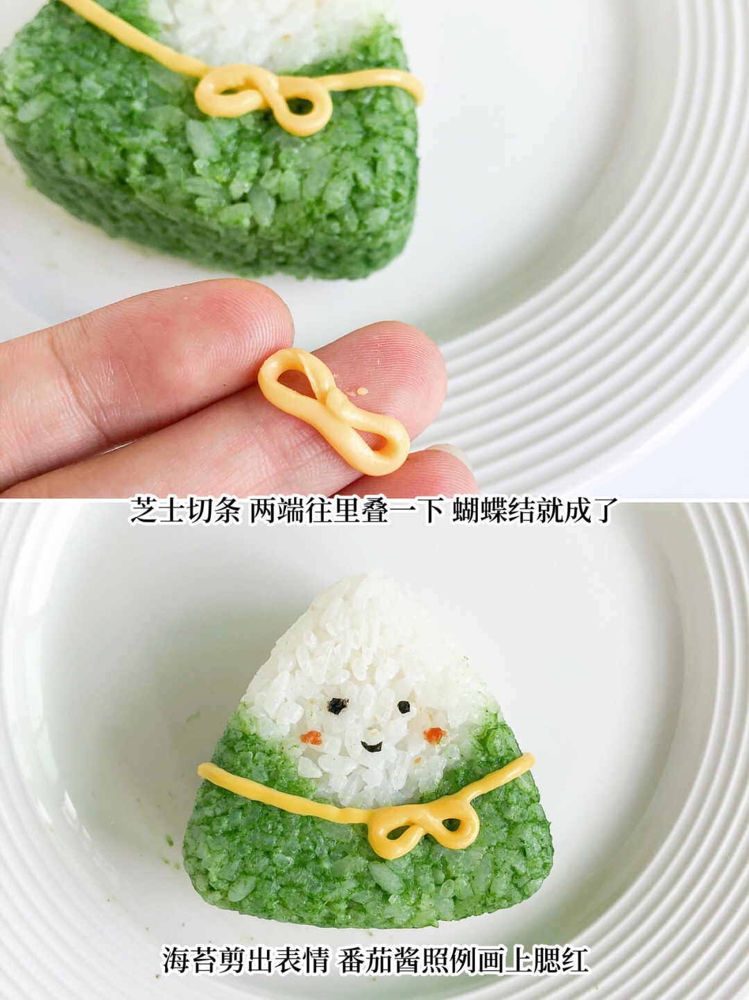 ❹海苔片剪出表情,番茄酱涂上腮红,可可爱爱的饭团粽子就做好啦。