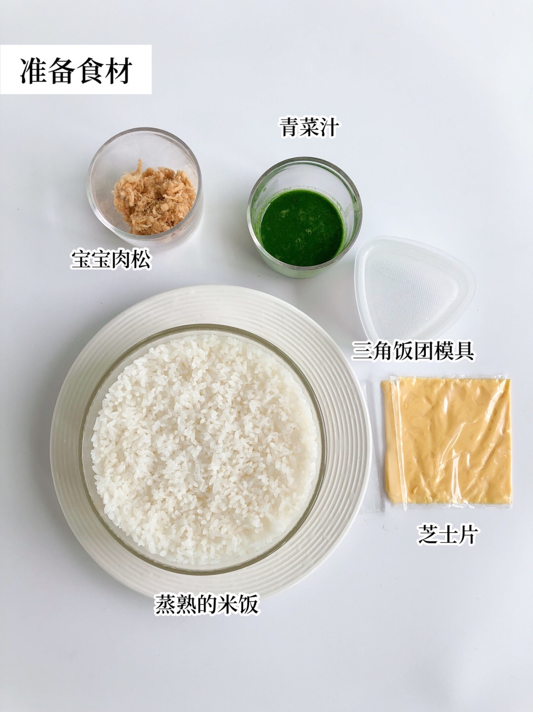 ❷绿色米饭放入模具里,压成V字,加一点白米饭填空,加入肉松,再盖上一层白米饭,压实