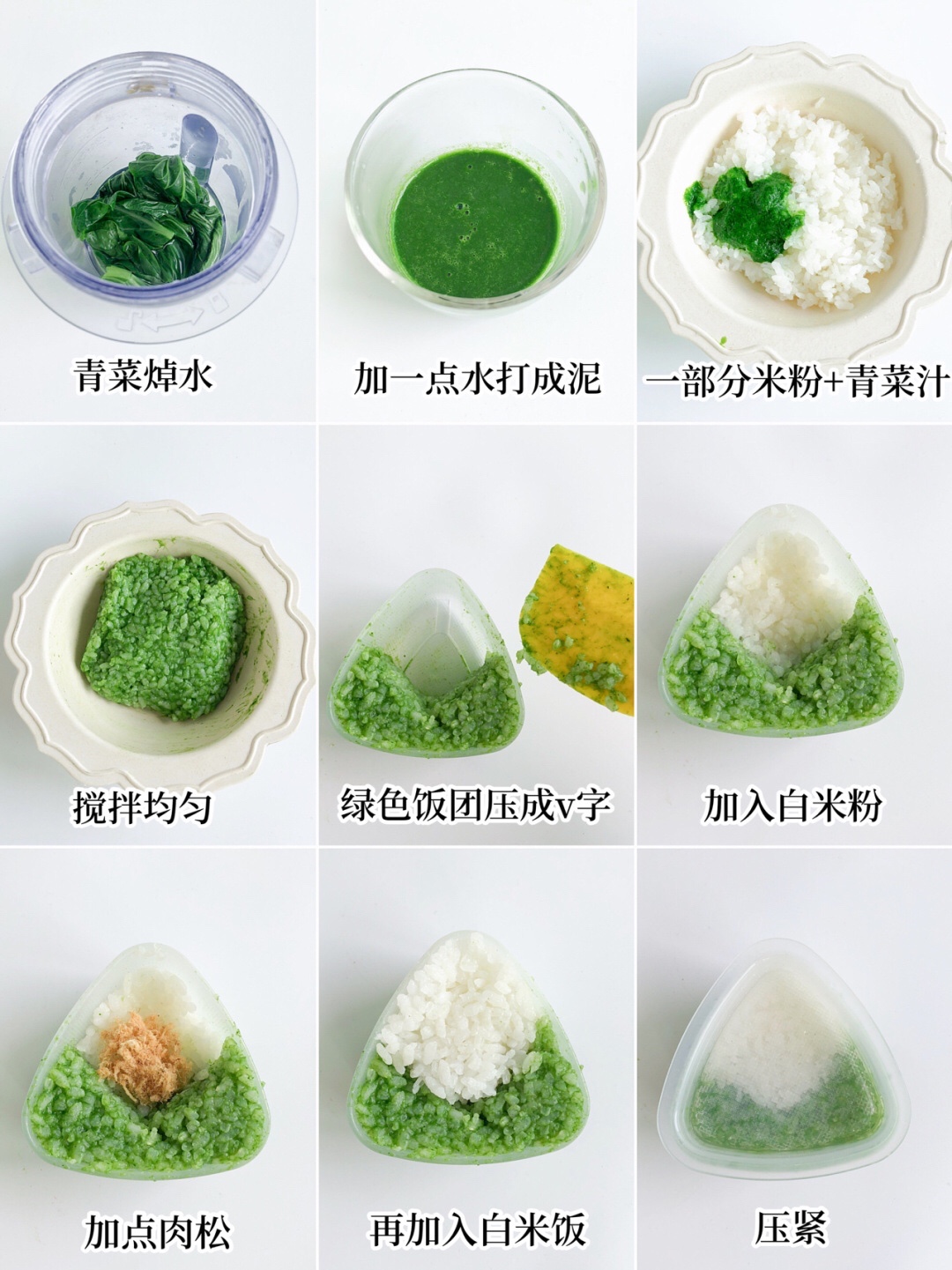 ❶米饭蒸熟,青菜焯水加一点水打成青菜汁,分一部分米粉加入青菜汁搅拌均匀。