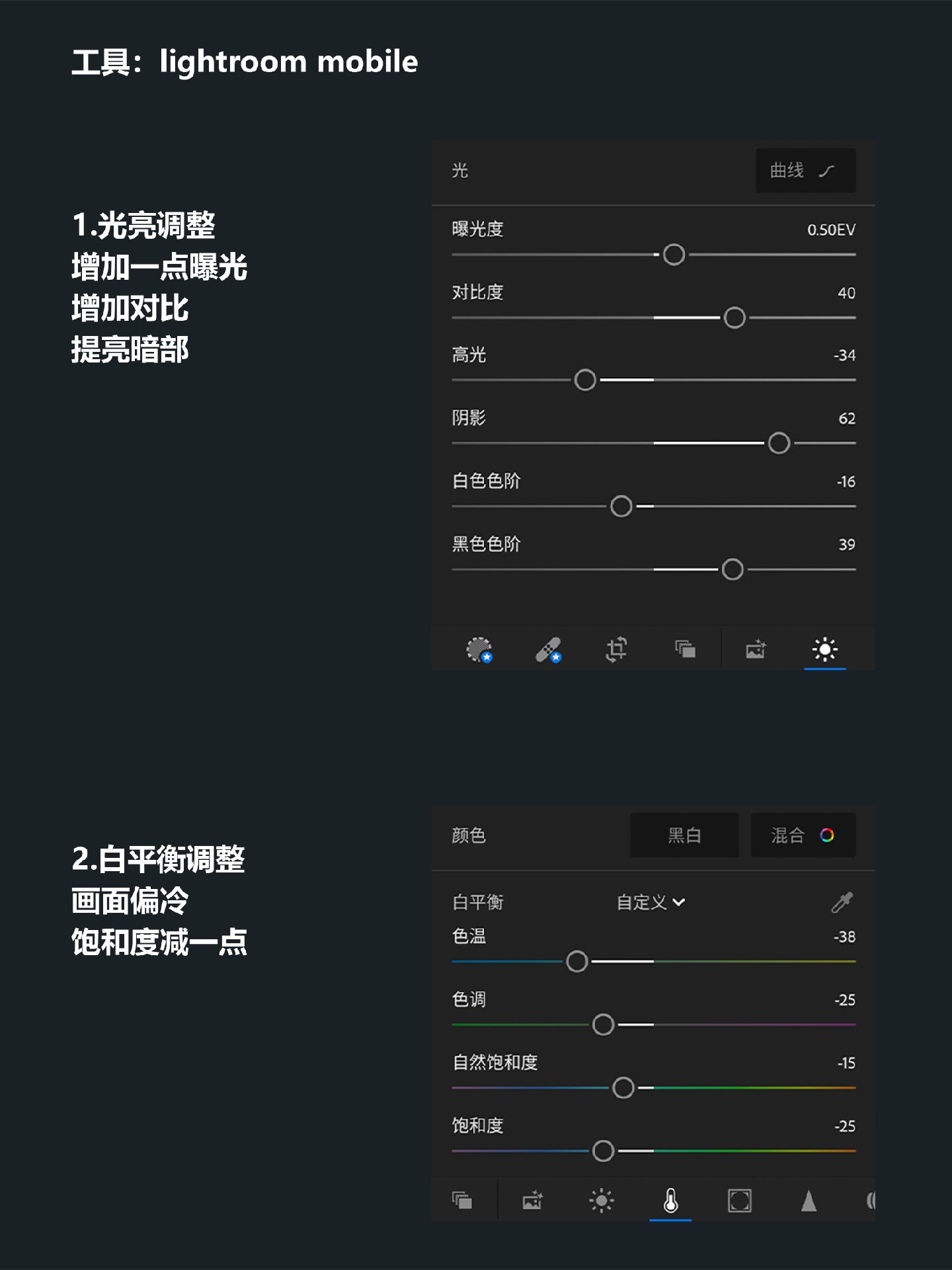 2⃣加一点曝光,降低高光,提亮暗部,加对比度