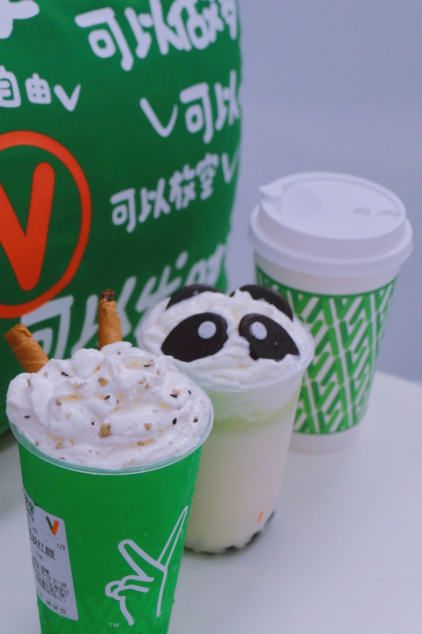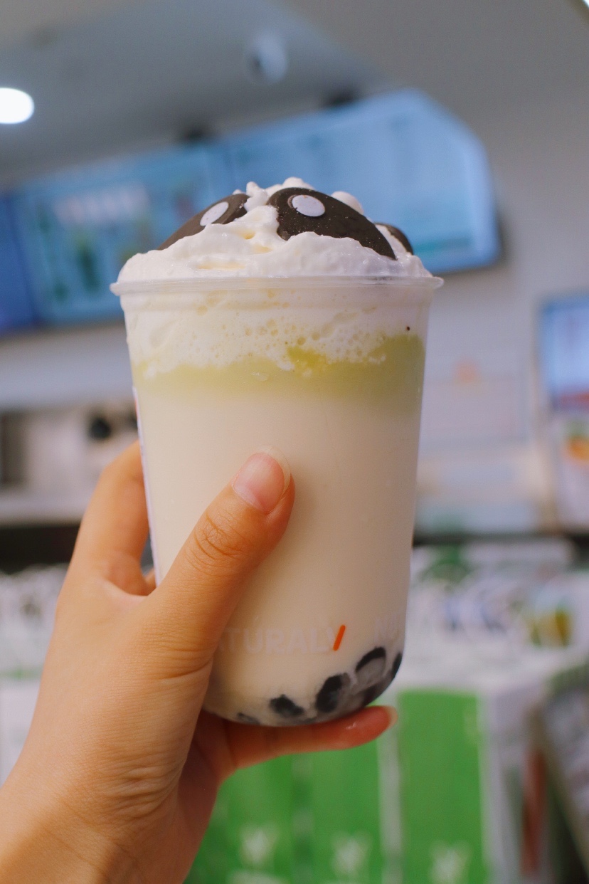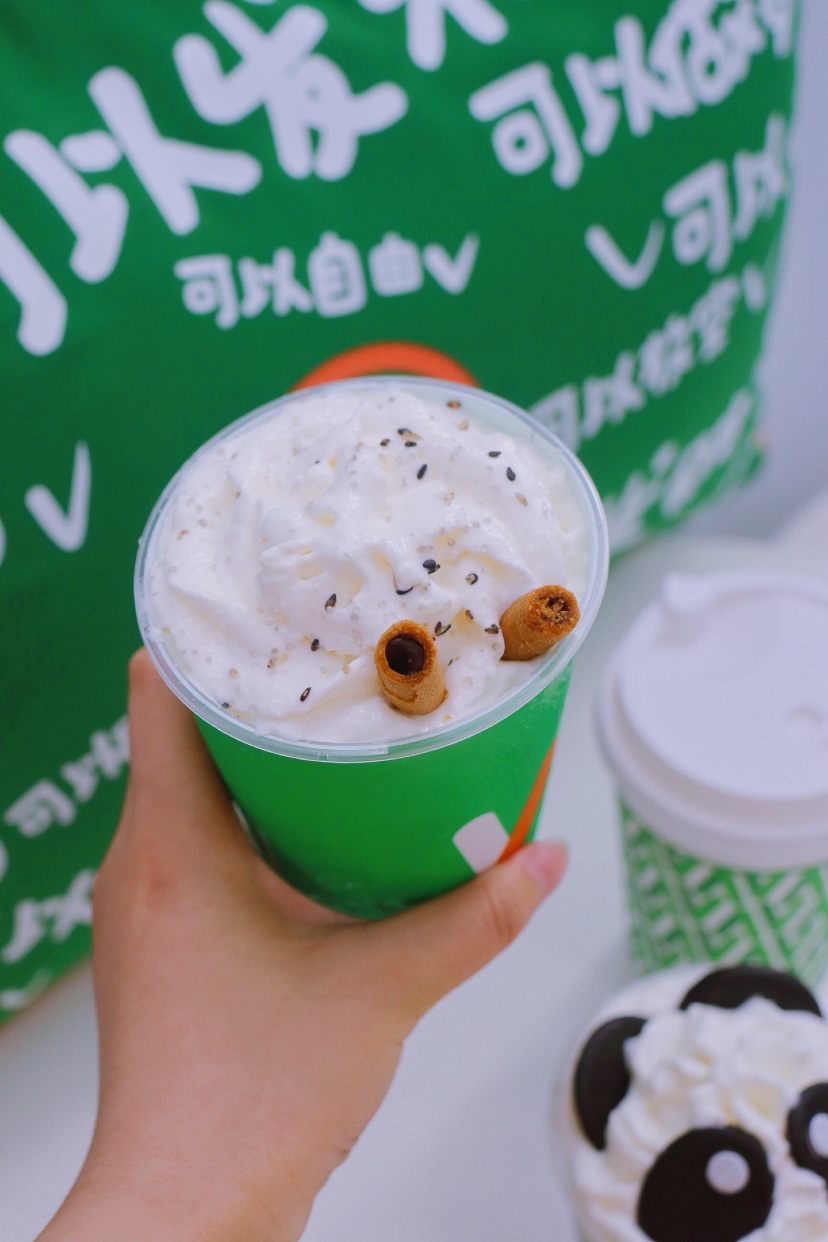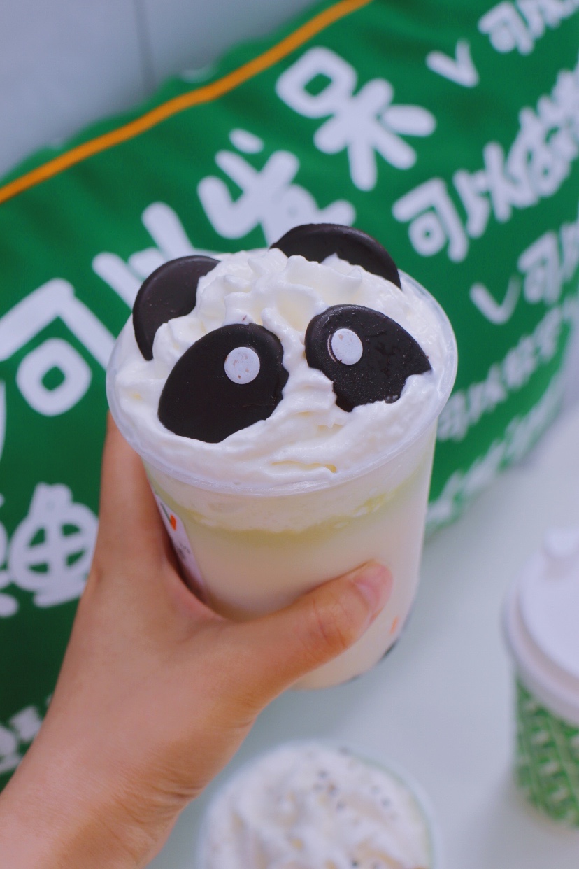 ✅熊猫🐼呆呆茶:顶部奶油顶中放了巧克力装点熊猫造型,十分呆萌可爱!茉莉鲜牛乳的味道特别浓郁,底部加入熊猫珍珠,黑白各半,非常还原成都的经典!