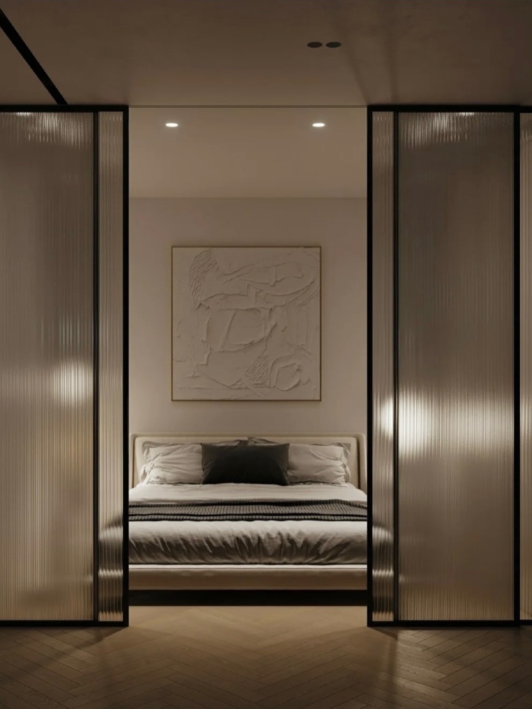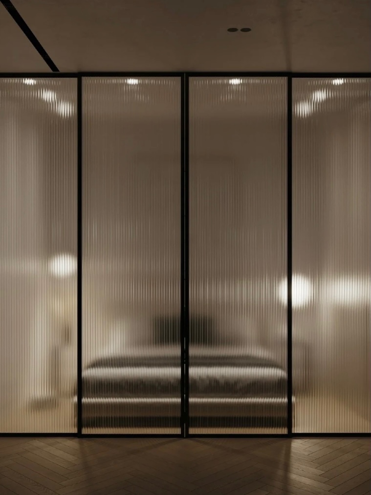 ➖但长虹玻璃的本身就是玻璃,所以具有玻璃自身的特点,透光,但是长虹玻璃自身的凹槽又有模糊现实的效果,所以产生了一种透光不透视的朦胧效果。竖直线的纹理更具有简约的几何美感,结合当下流行的极简风格、轻奢风格更为适合🧡