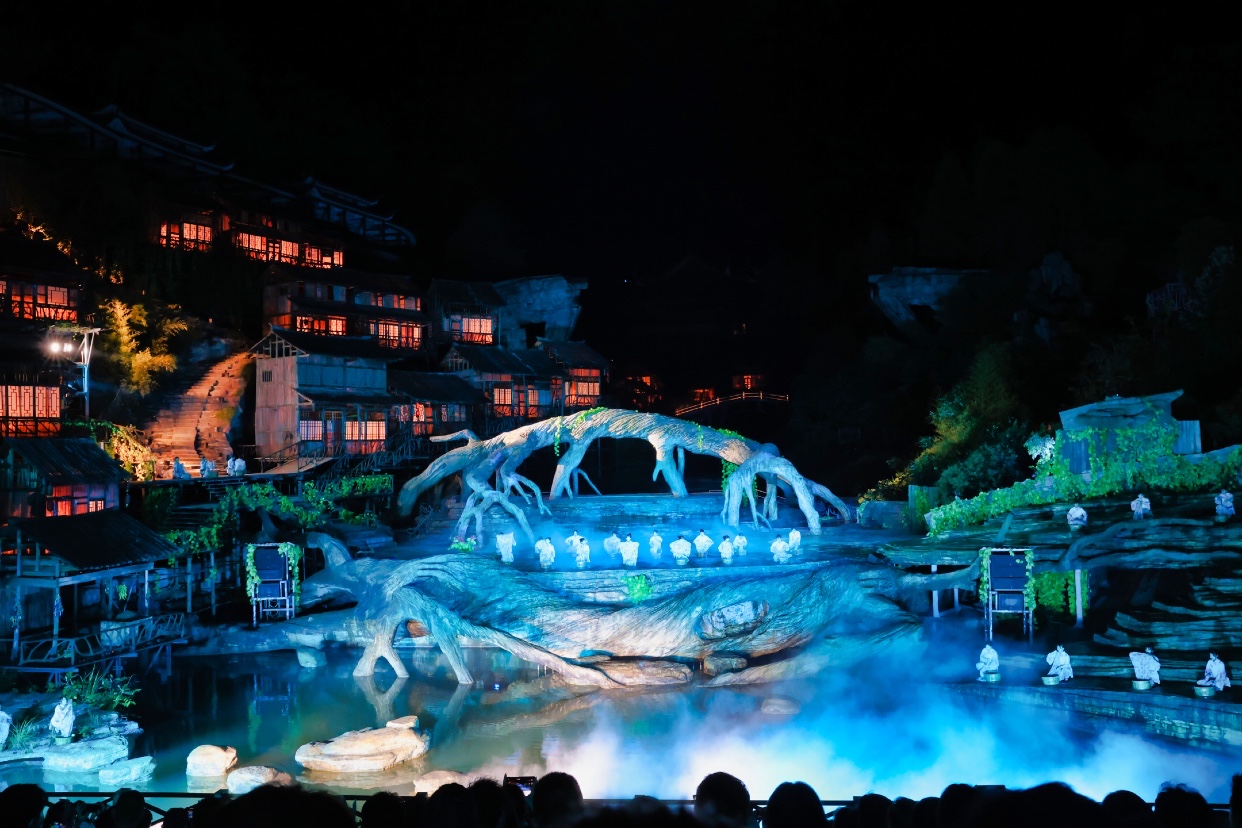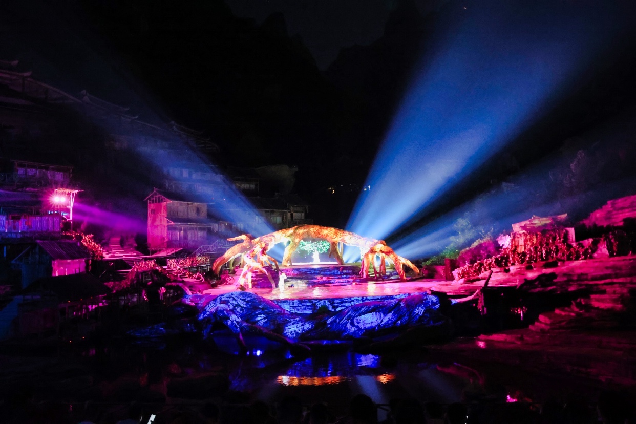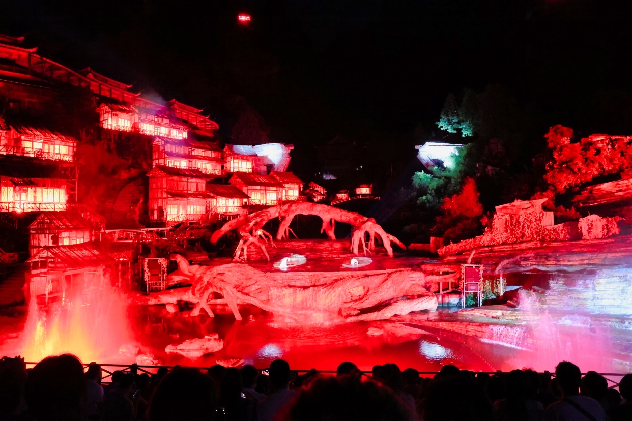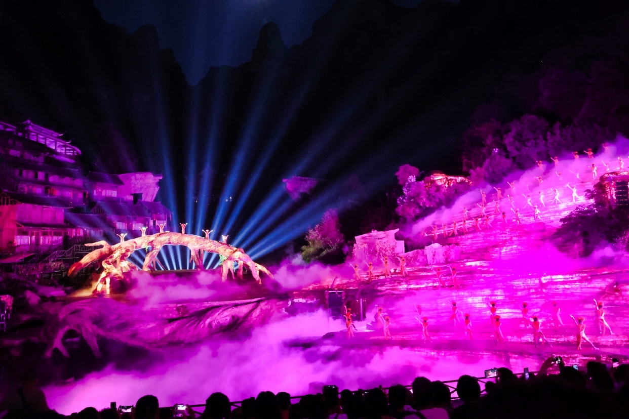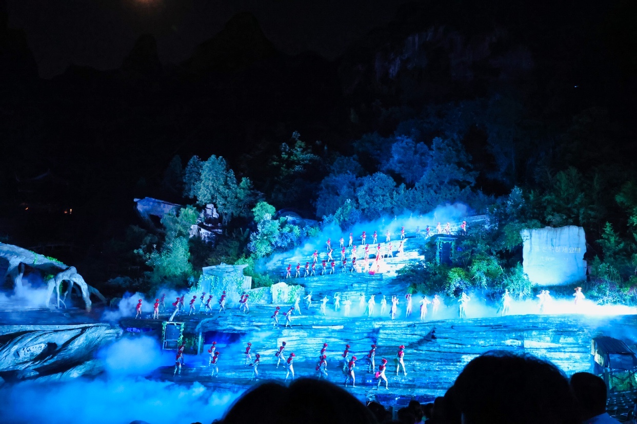 来天门山一定还不能错过的就是这个天门狐仙的表演了,整个表演大概有1个小时左右,讲述了一个人和狐狸相爱的故事。更准确的说,是一个改编版的刘海砍樵的故事。