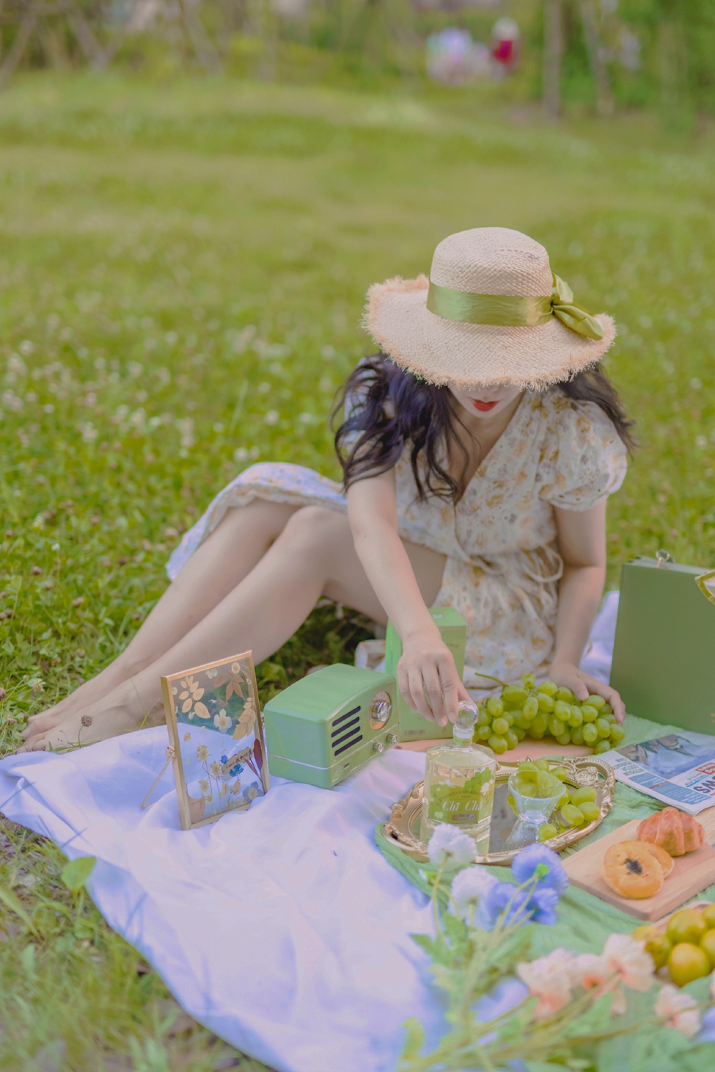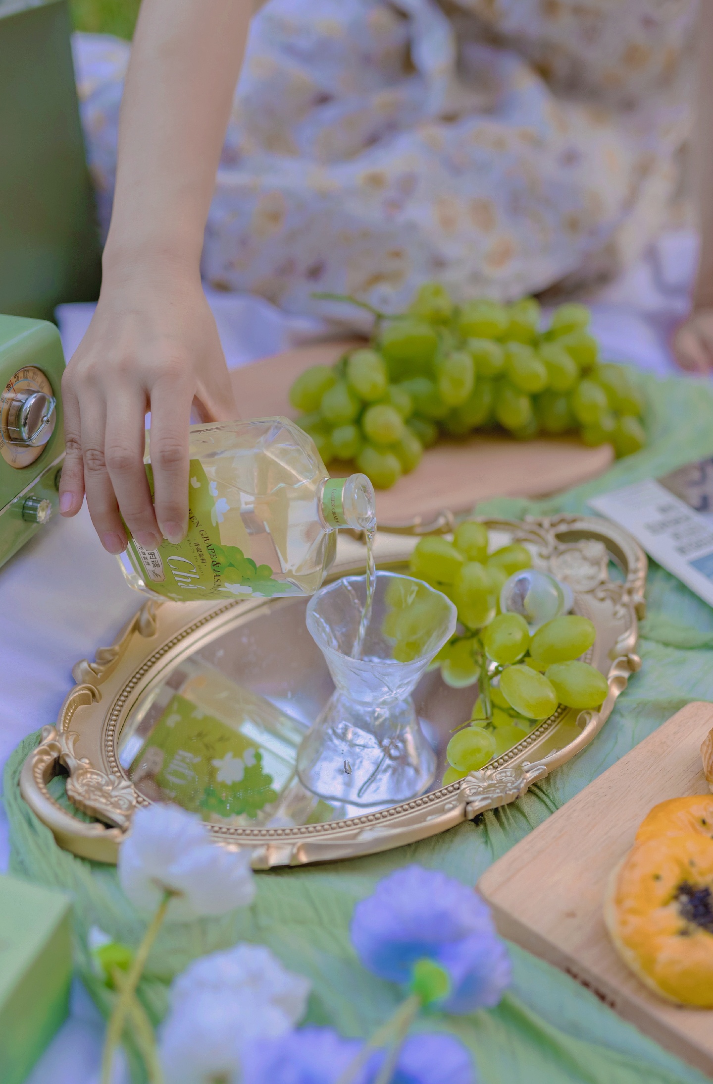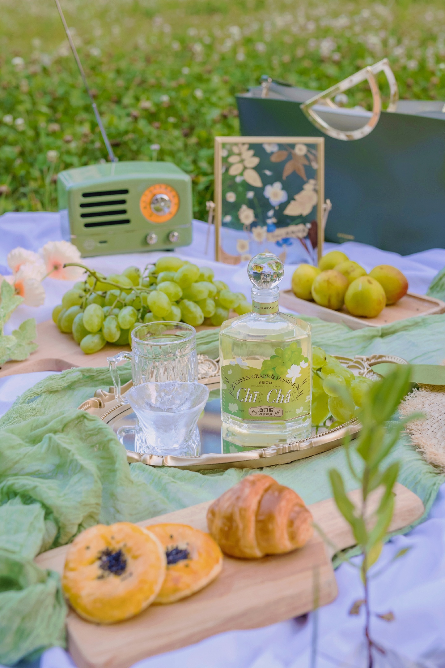 一瓶漂亮的小酒已经让好看的野餐布置成功了一半,酒甜甜的,适合女孩喝,散发茉莉清香和葡萄果汁味道。瓶子喝完留着做道具。