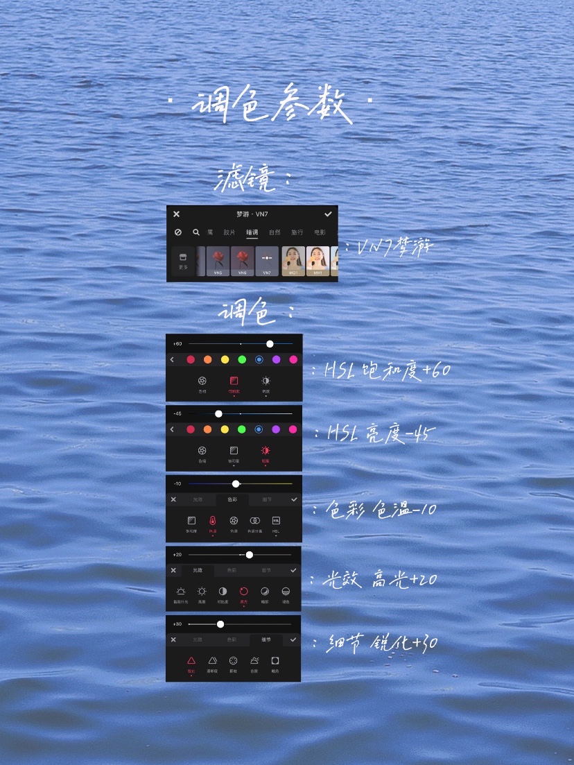 2.色彩:色温-10,蓝色HSL(饱和度+60、亮度-45);