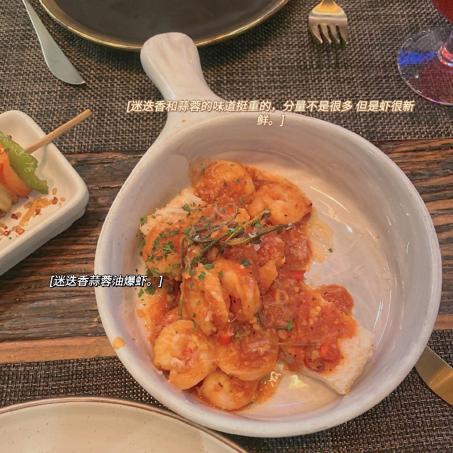 这个菜分量不是很多 迷迭香和蒜蓉的碰撞是这道菜的特色 味道很丰富 虾肉肉质很鲜 不是很接受迷迭香的可以不点这个