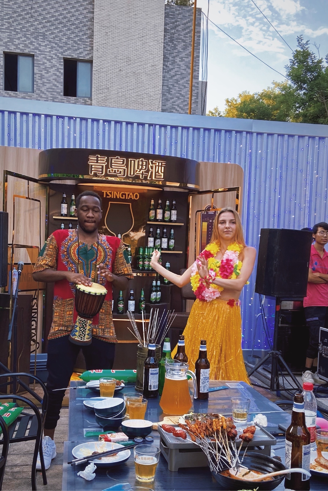 夜晚户外庭院气氛绝佳,驻唱歌手、美女起舞嗨翻全场!
