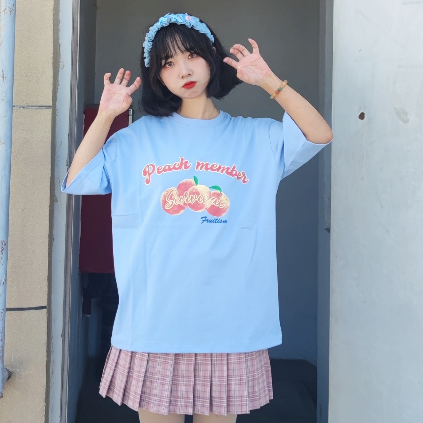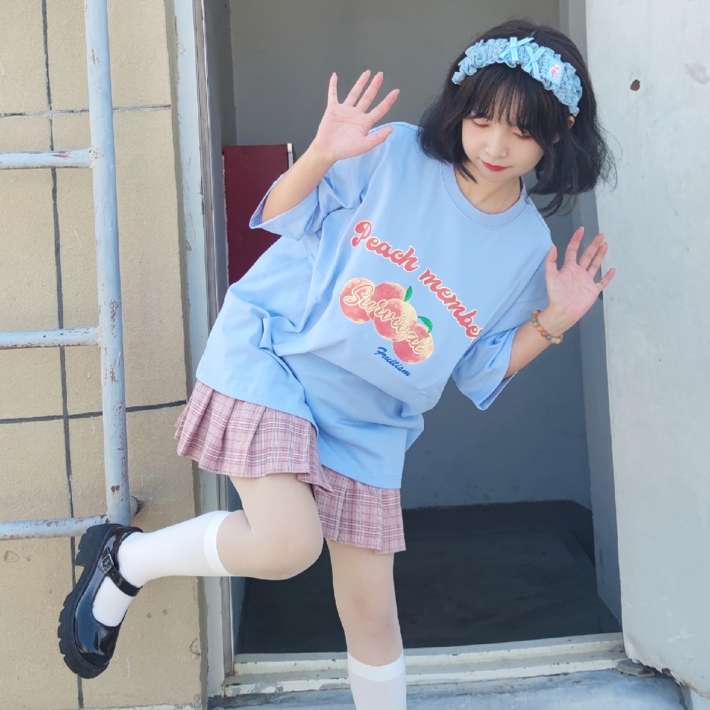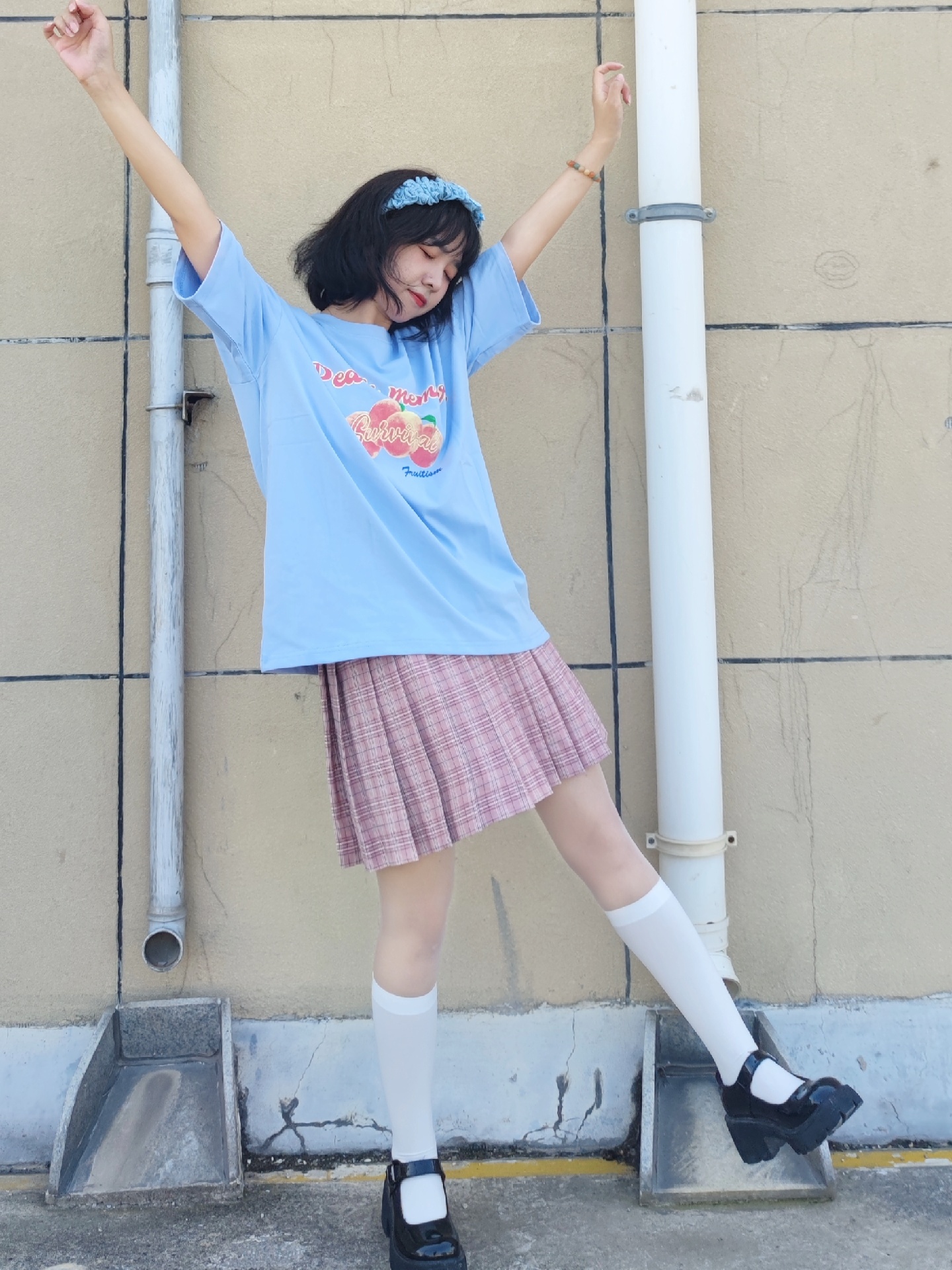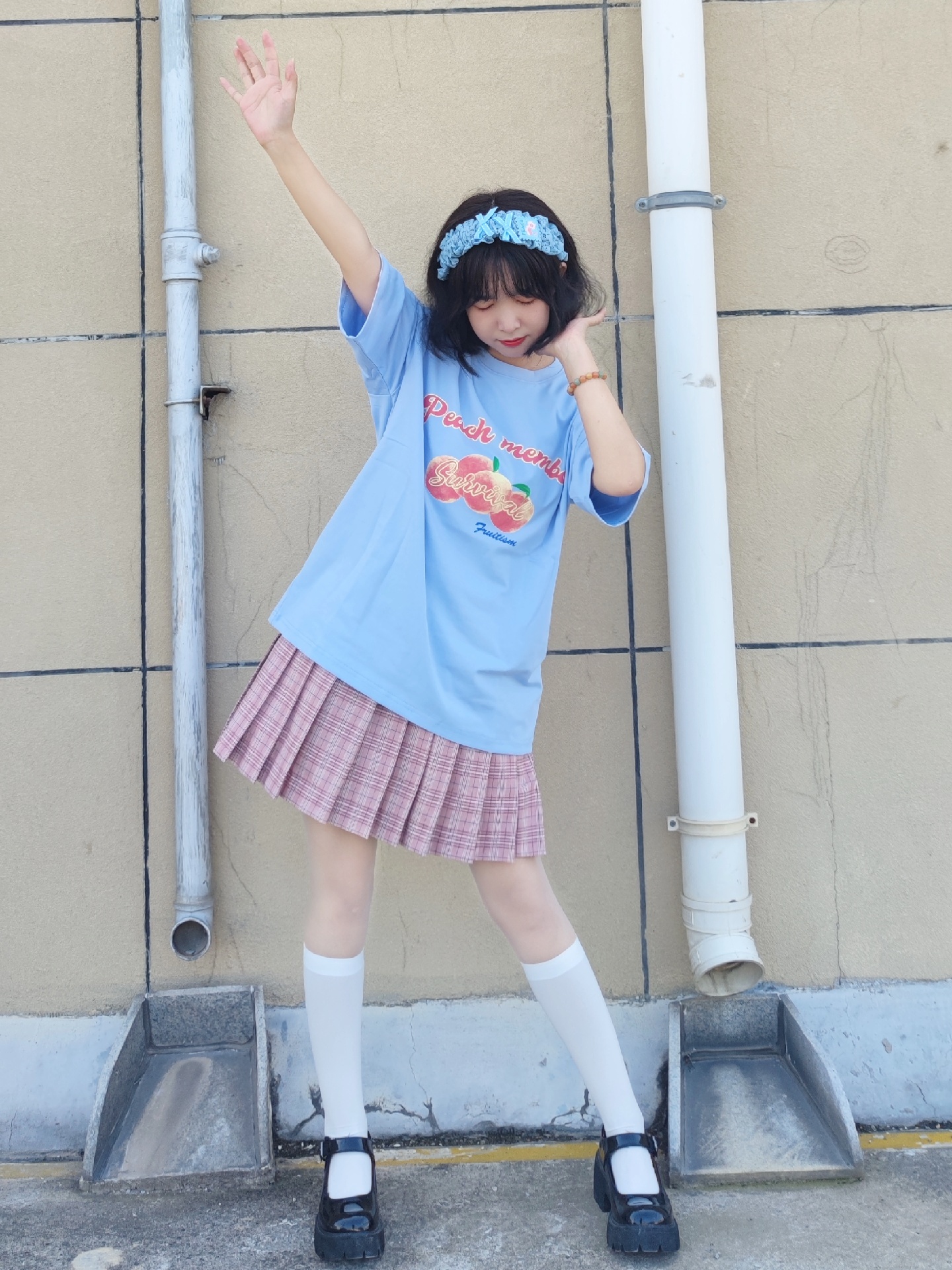 今日是蜜桃感女孩,蓝色T恤上印粉色蜜桃,真的太可爱啦!搭配粉色百褶裙~蜜桃感十足啦!蓝色发箍我也超喜欢!绝绝子!