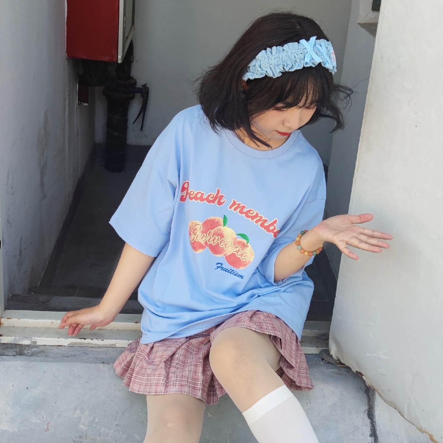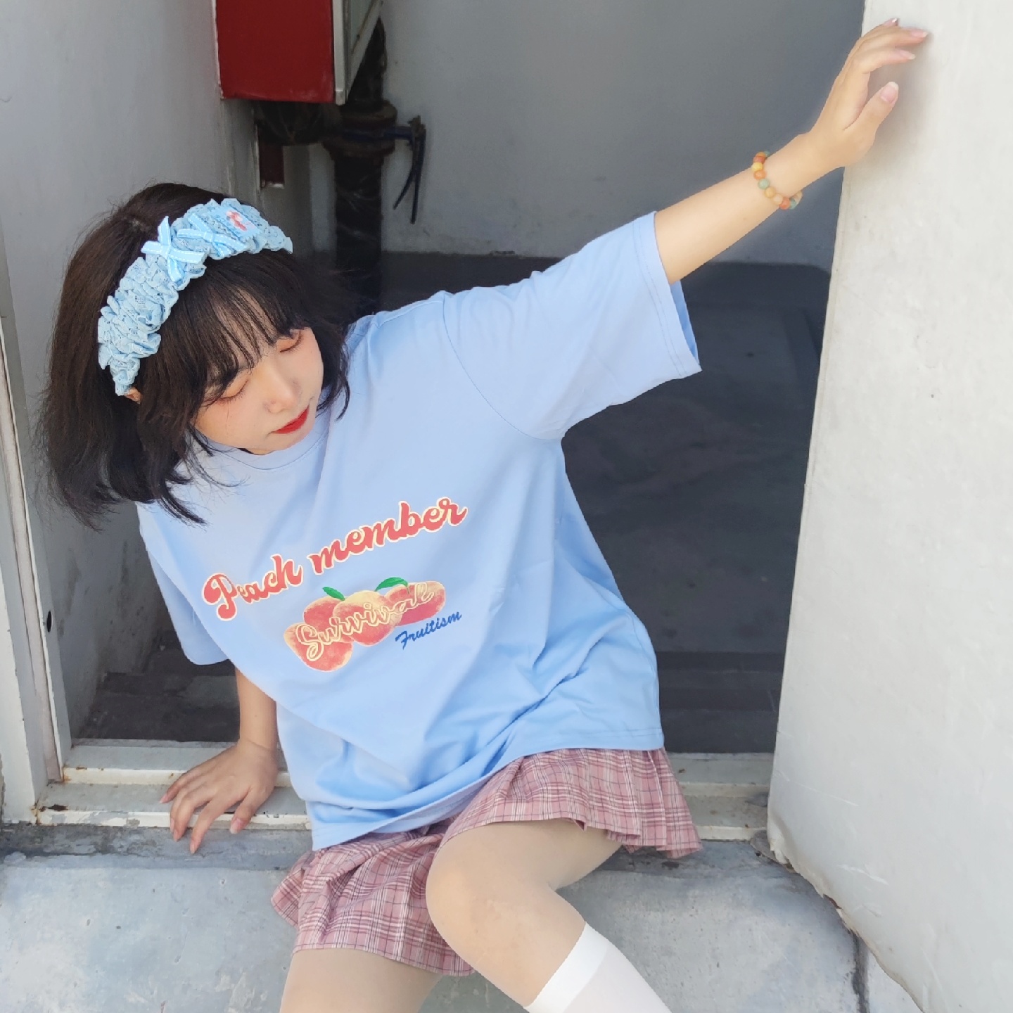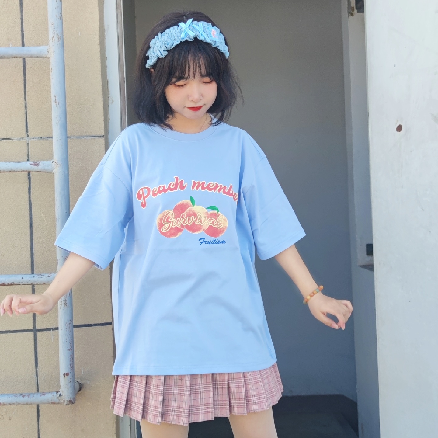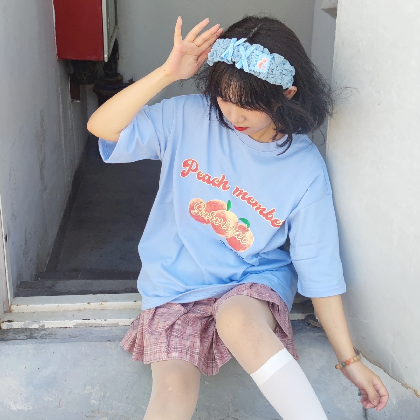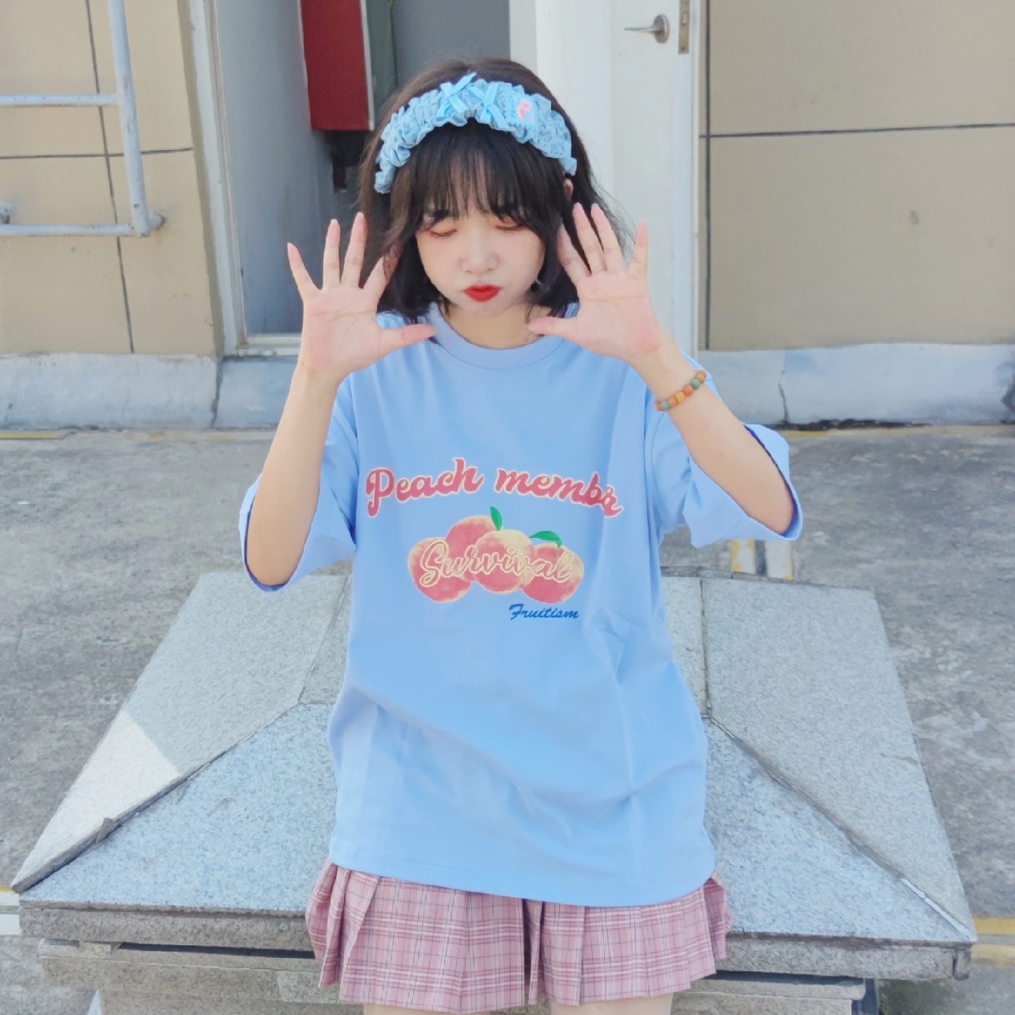今日是蜜桃感女孩,蓝色T恤上印粉色蜜桃,真的太可爱啦!搭配粉色百褶裙~蜜桃感十足啦!蓝色发箍我也超喜欢!绝绝子!