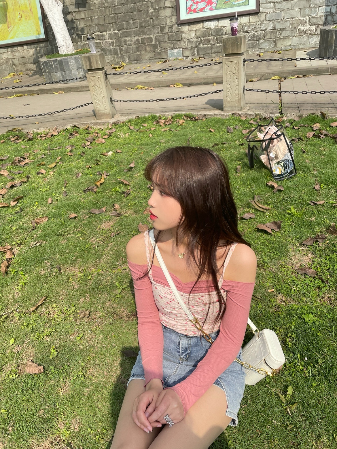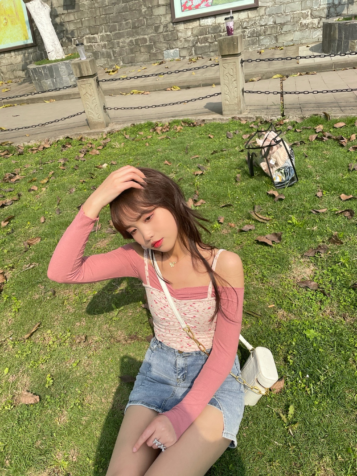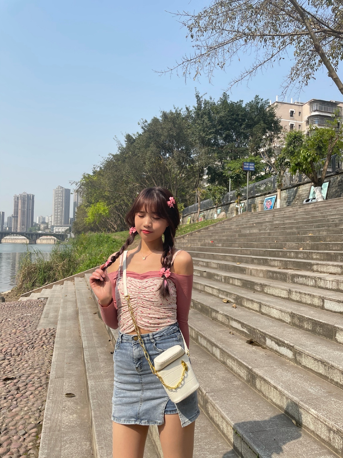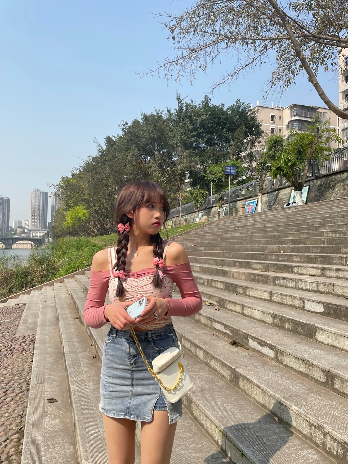 粉色碎花小吊带➕一字肩紧身t,在搭配上一条紧身牛仔半裙,辣妹的感觉来啦~