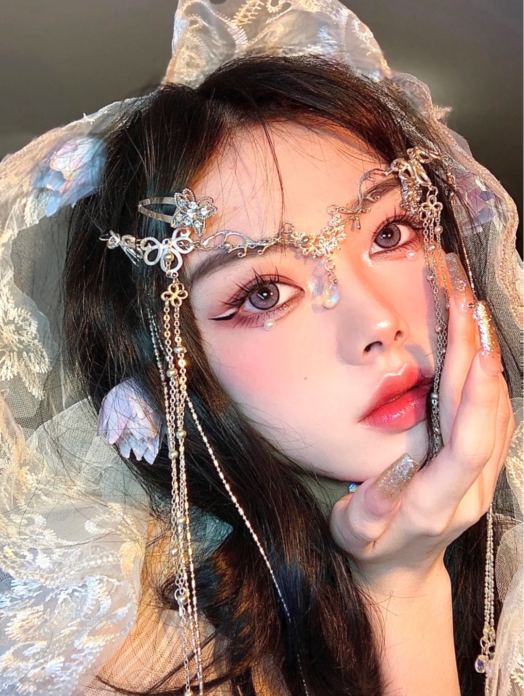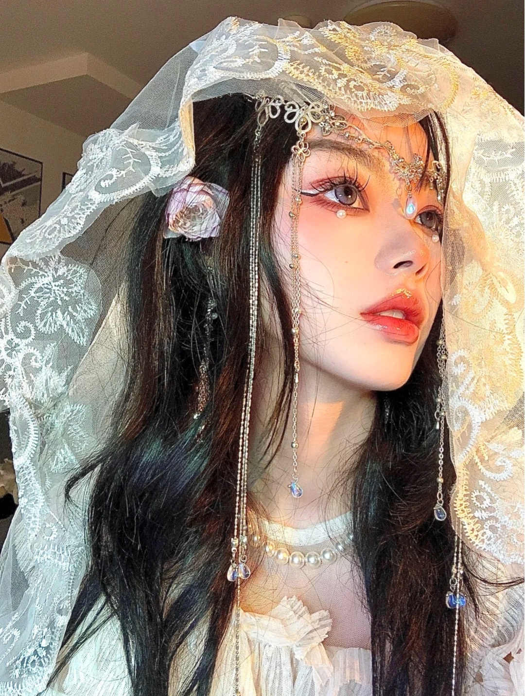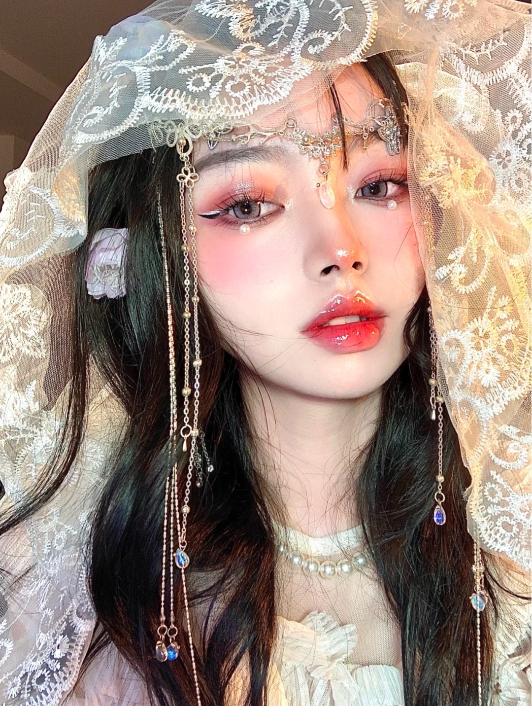 妆容上白色眼线笔叠加画上去真的是精髓一笔!嘟嘟唇加高光我的坠爱嘿嘿 眼下还可以贴颗小珍珠,仙气满满~道具是很早之前买的一块头纱拍出来真的有被自己美到!又是自恋的一天