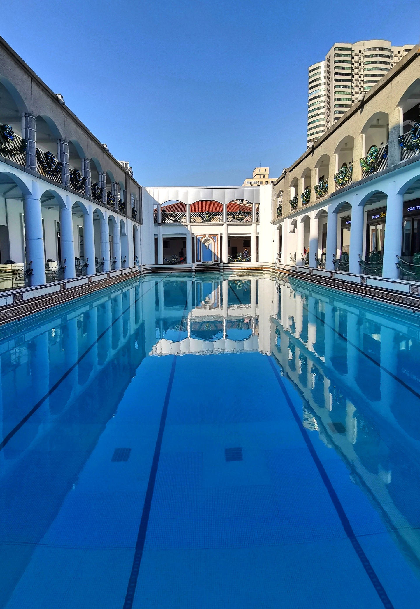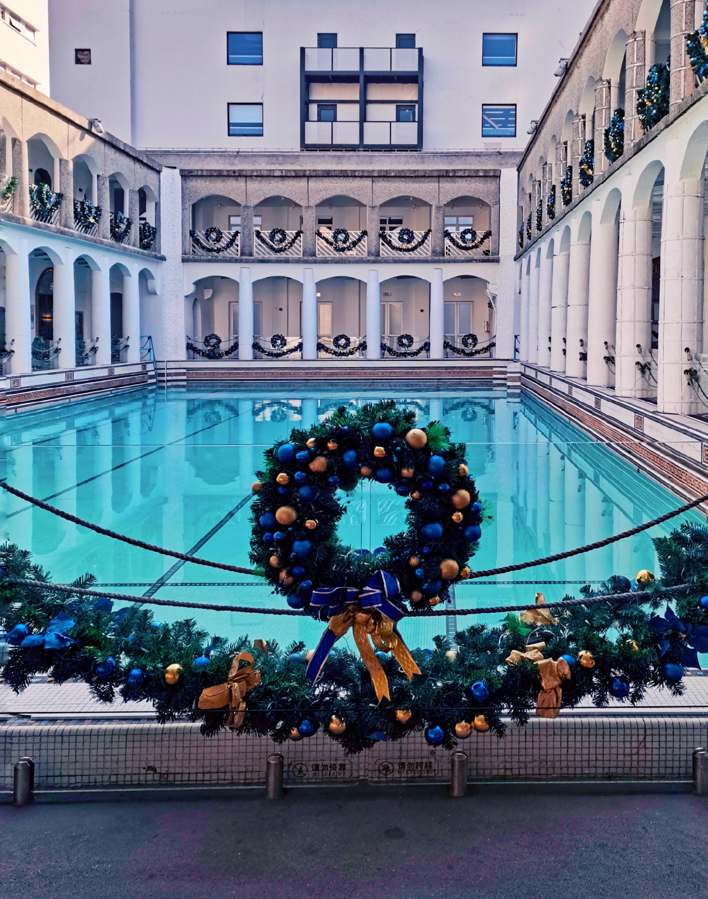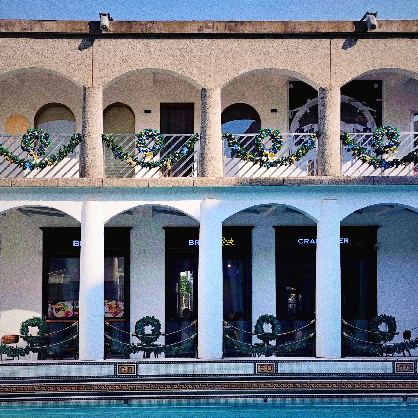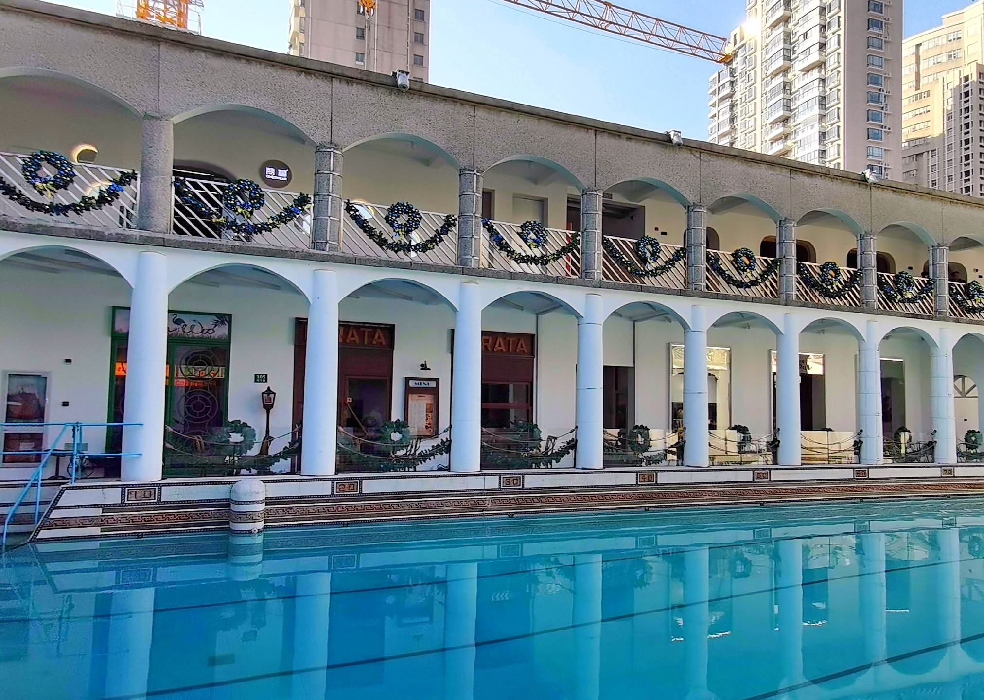 上海延安西路1262号上生•新所,海军俱乐部内的摩洛哥风格的露天游泳池,建于1925年,是上海仅存的“英制”泳池。泳池水质清澈湛蓝,池边马赛克地砖光艳如新,四周装饰精美,并设有餐厅、酒吧和咖啡馆。(2)