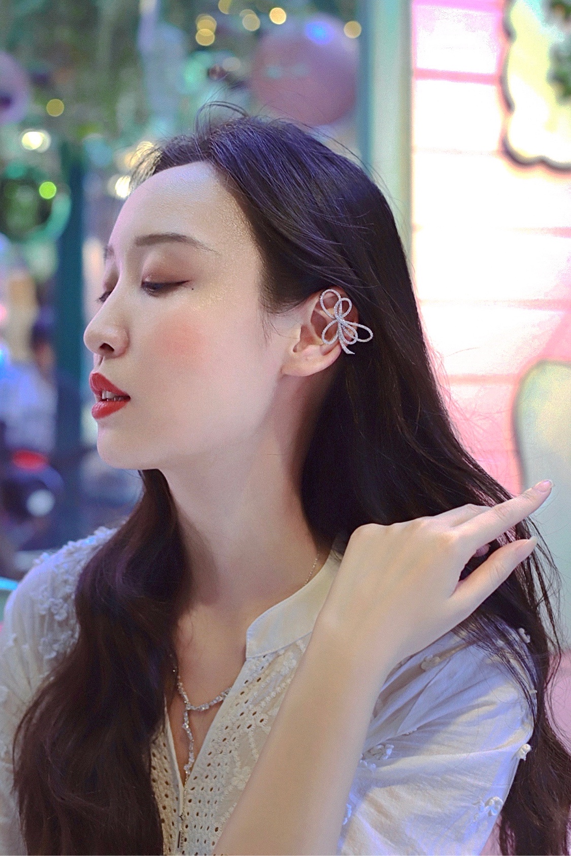 蝴蝶耳夹和项链都是BOONEE家的,尤其是蝴蝶耳夹真的美出天际🎀喜欢这款项链的大气设计,搭配v领的服装刚刚好了🌟