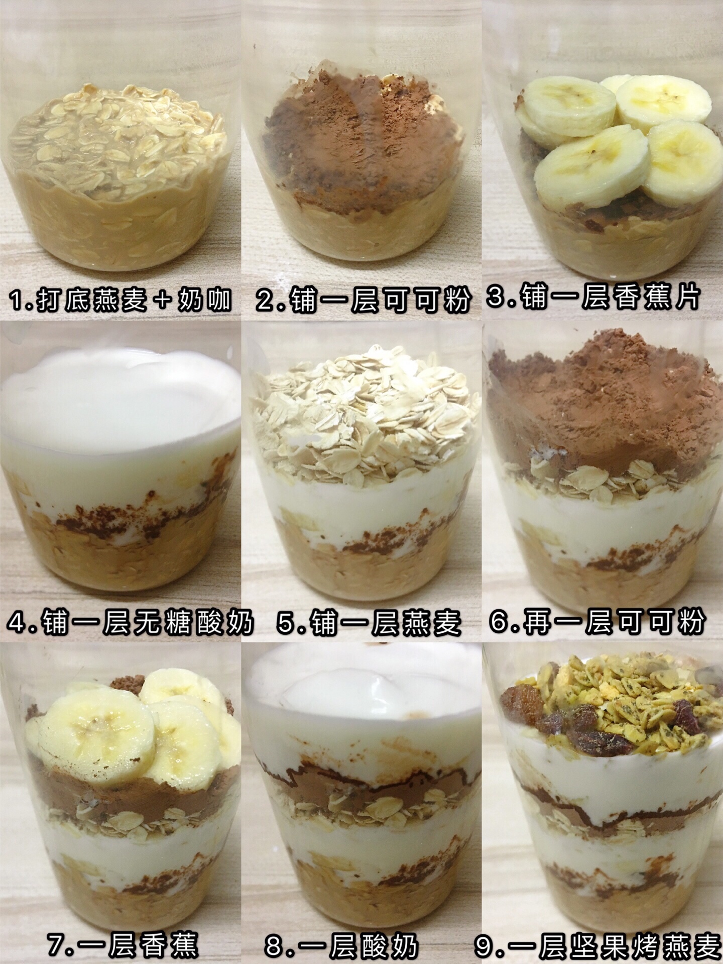 🔸食材:原味即食燕麦、坚果烤燕麦、香蕉、牛奶、无糖酸奶、可可粉、咖啡粉