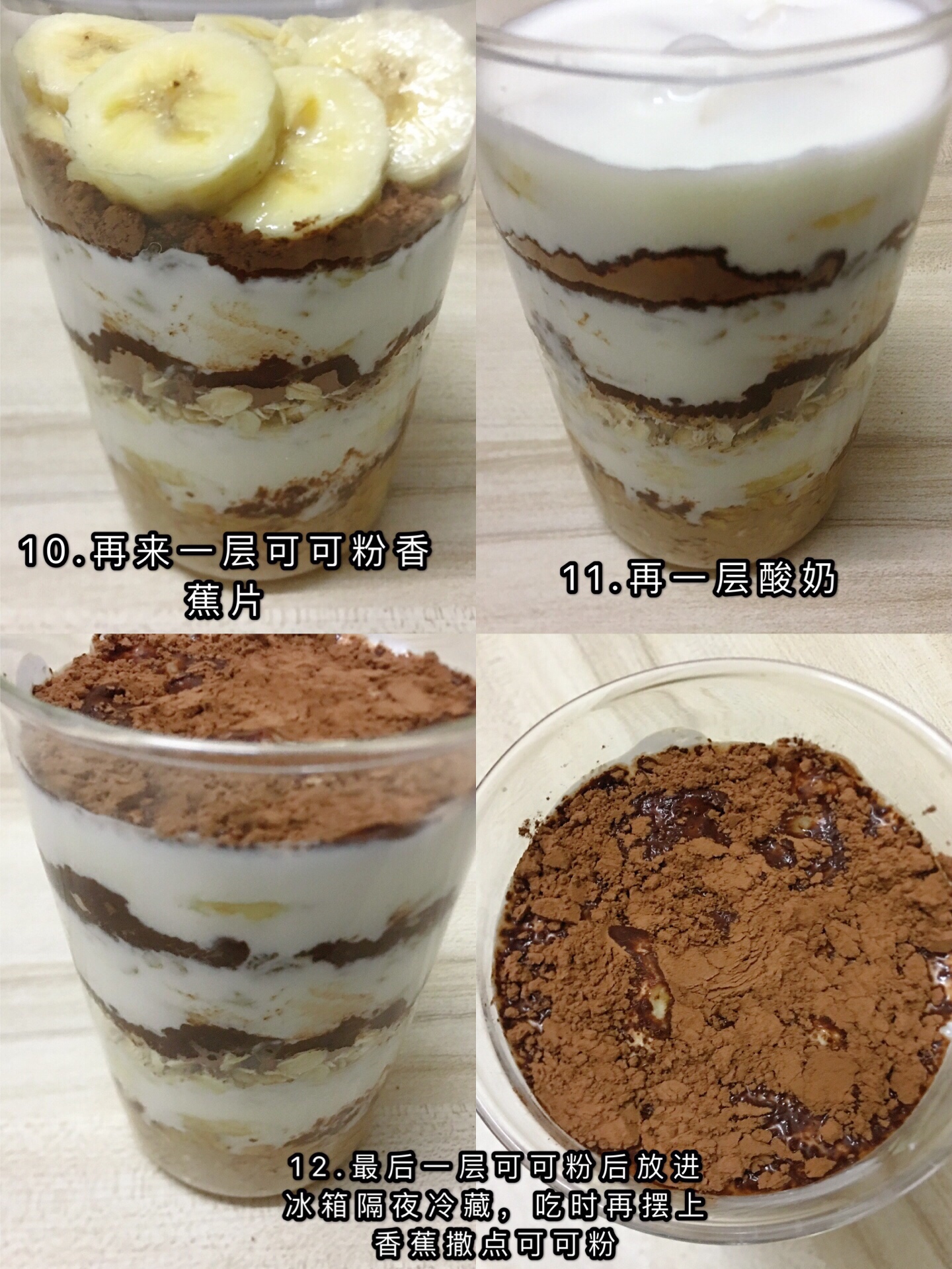 再来铺一层可可粉、一层香蕉片、一层酸奶,再铺一层燕麦、一层可可粉、一层香蕉、酸奶,最后来铺一层坚果烤燕麦、一层可可粉、香蕉、酸奶、可可粉后放进冰箱隔夜冷藏,吃时放上香蕉撒可可粉摆块巧克力🍫就做好了~真的超好吃😋墙裂推荐❗❗@MT小助手