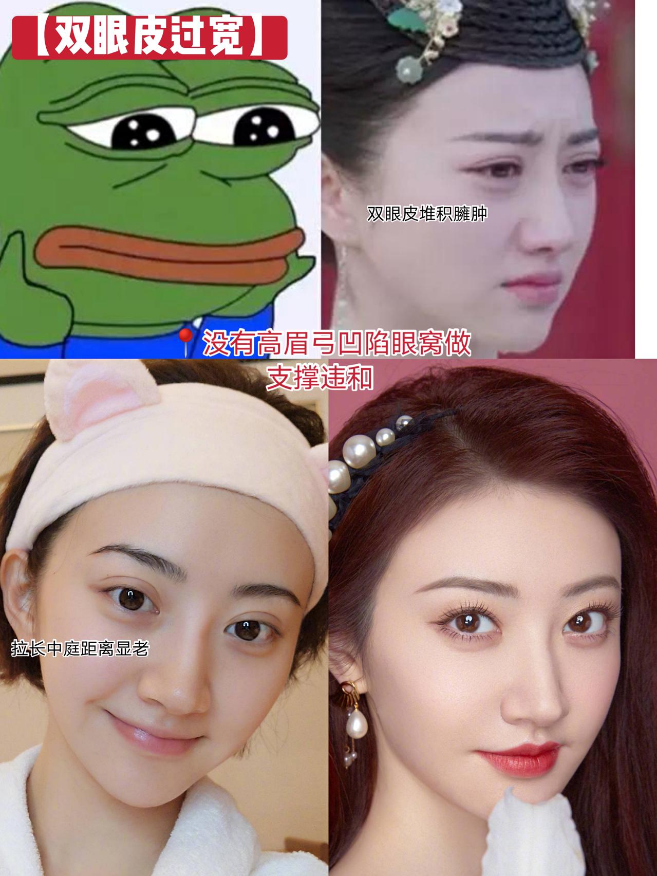 此外双眼皮过宽,还容易变成青蛙眼,景甜的双眼皮就是因为做太宽,睁眼时,睑板就不能带动上睑皮肤发生遮盖,让眼部皮肤都堆积在上眼睑,产生肉条感和凸眼,变成青蛙眼