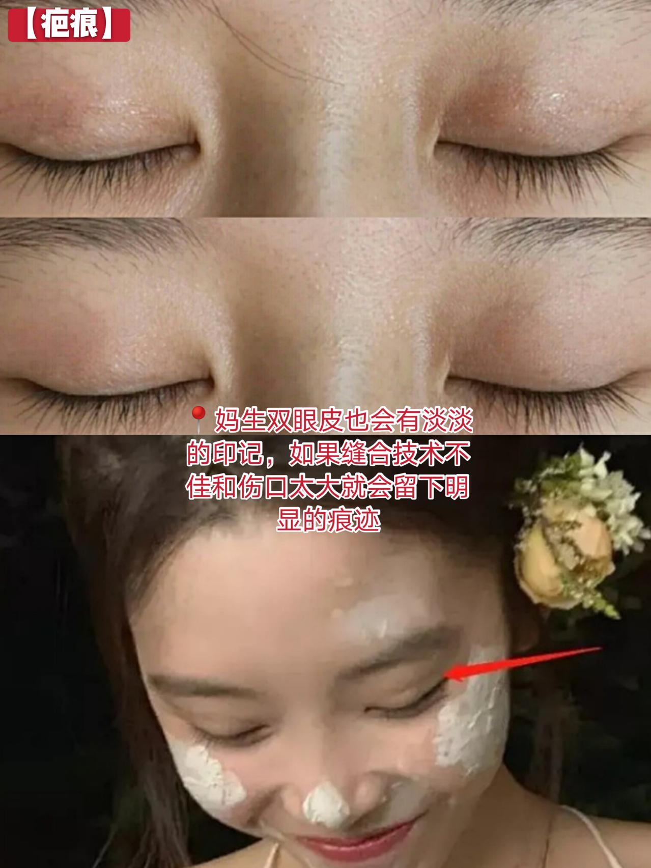 很多天然的双眼皮在闭眼时,也会有淡淡的一条痕迹,割完双眼皮有轻微的痕迹也是比较正常的,但如果双眼皮缝合技术不到位或者伤口太大就会留下“杀猪刀”般的痕迹