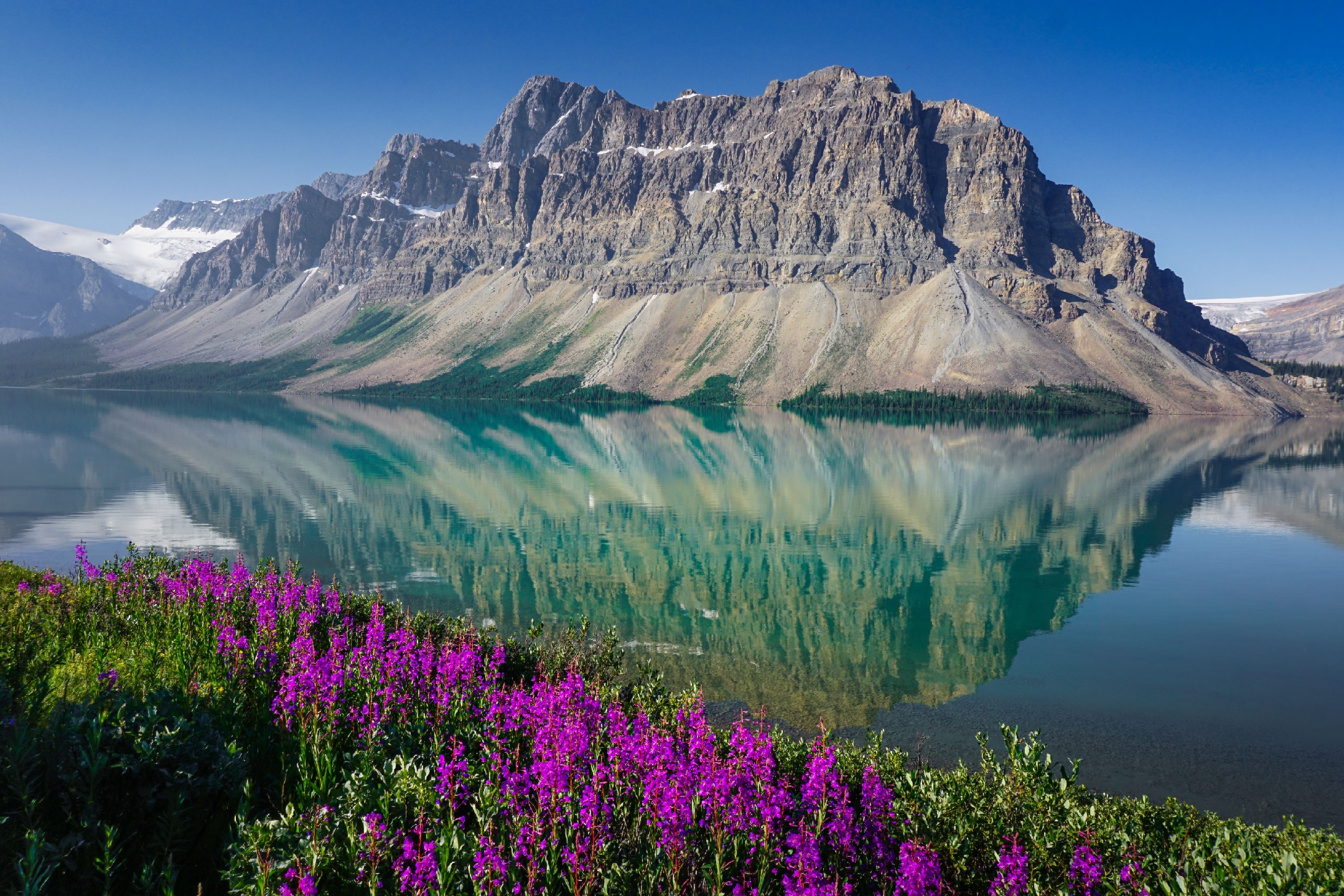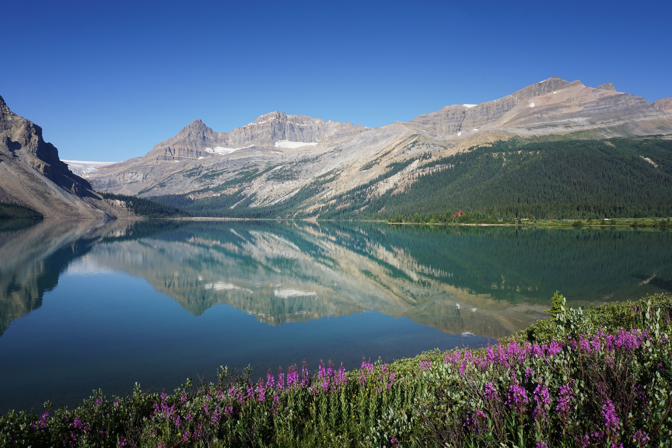 班芙国家公园夏日的弓湖。火烈花开满了湖边。热烈异常。
