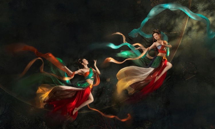 大家都知道敦煌莫高窟的“飞天”壁画,它来源于古印度,指的是佛教里乾闼婆和紧那罗的结合体,他俩能歌善舞、可翱翔于云霄,因此壁画中的天神都衣抉飘飘,仿佛在云端起舞。