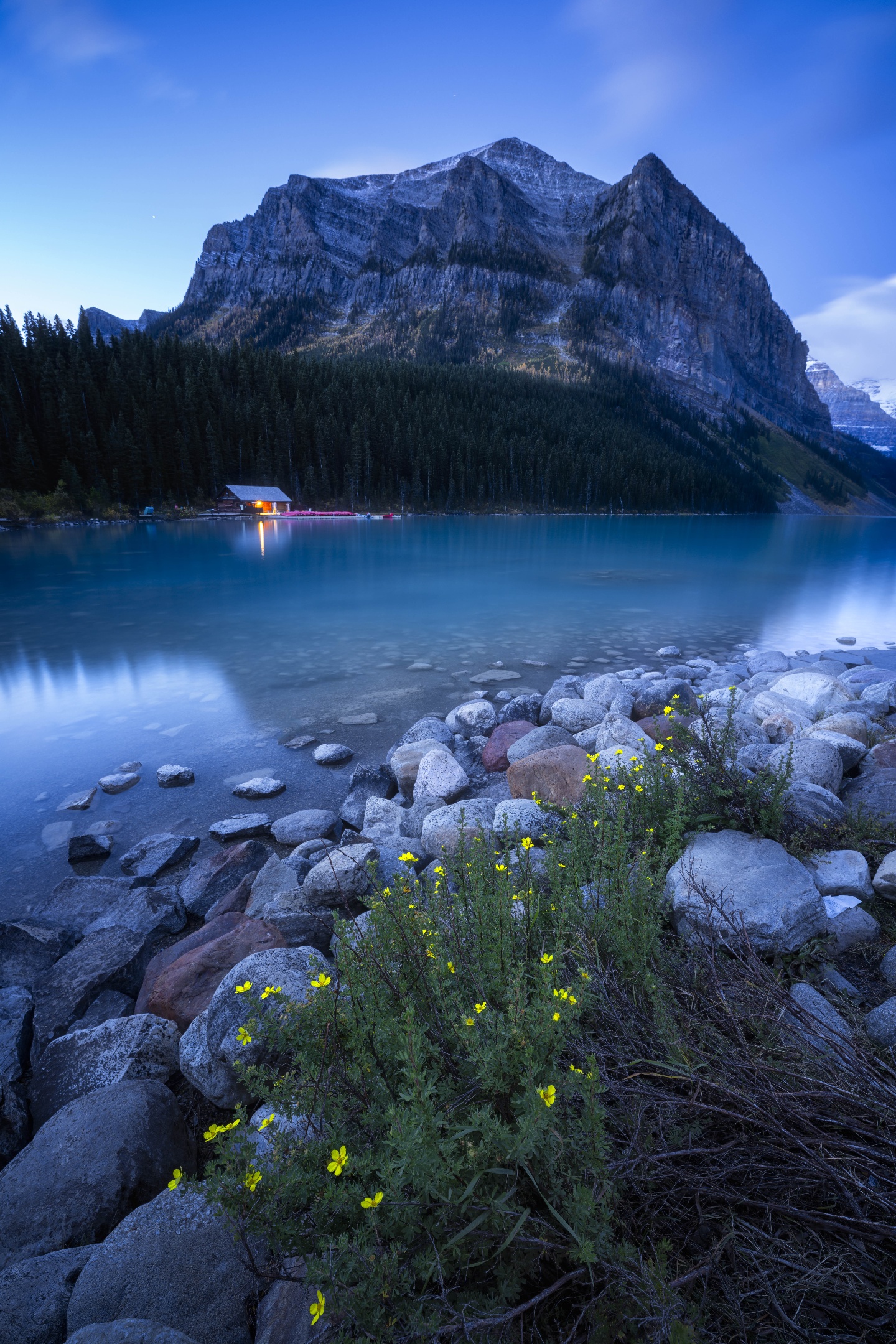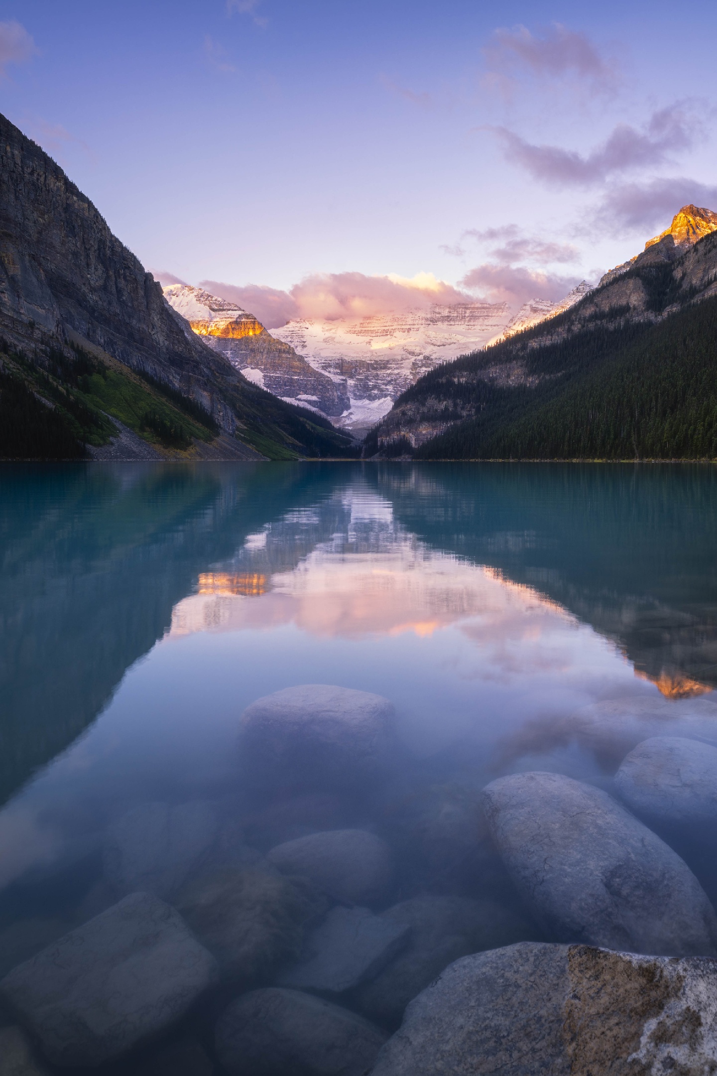 晨曦的路易斯湖,仙境一般的模式夏日的精彩。