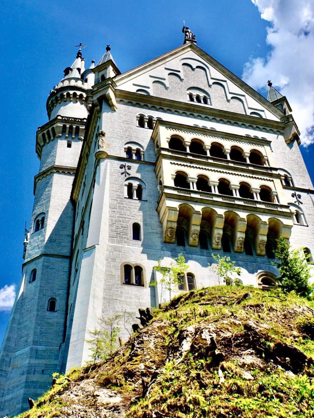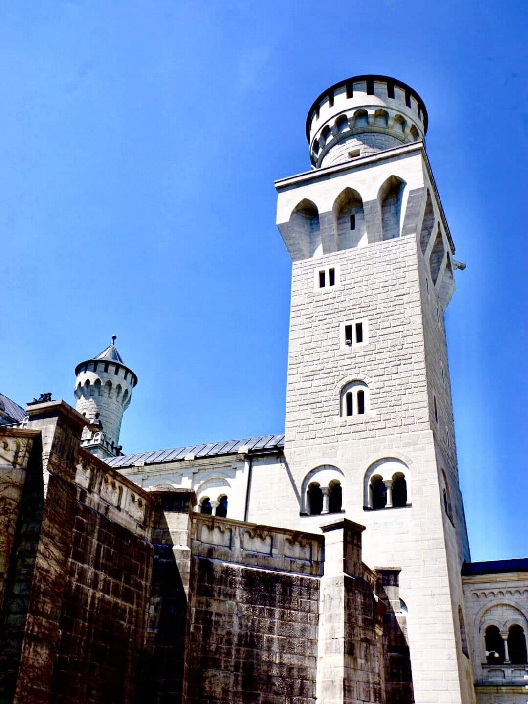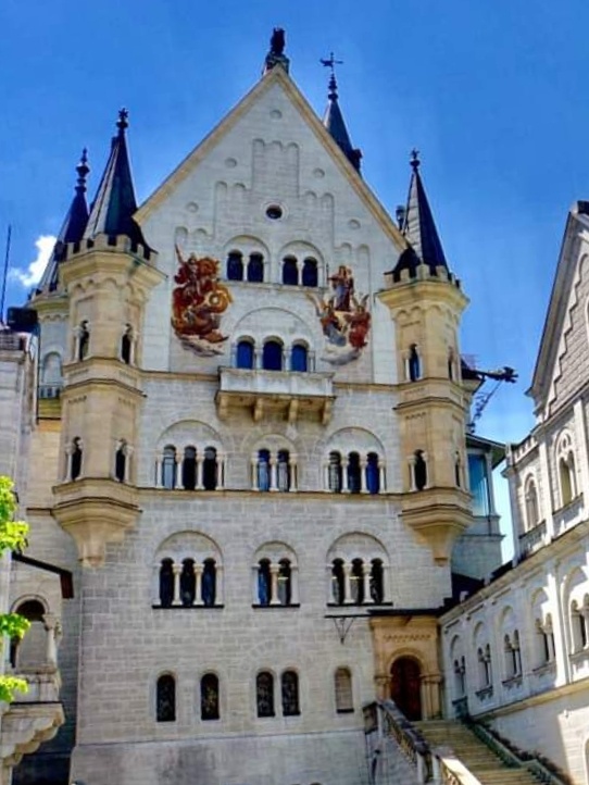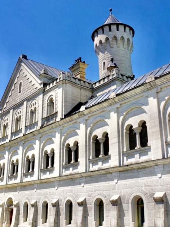 德国巴伐利亚省西南方霍恩施万高的新天鹅堡,全名为〈新天鹅石城堡〉,城堡建筑在隶属阿尔卑斯山脉近一千公尺的山顶上,是19世纪晚期的古罗马式建筑,城堡是巴伐利亚国王路德维希的行宫之一,共有360个房间其中只有14个房间依照设计图完工,其他房间则因国王1886年逝世而未完成,新天鹅堡是德国境内受拍照最多的建筑物,迪士尼乐园标准LOGO中的城堡就是以新天鹅堡为模型设计。